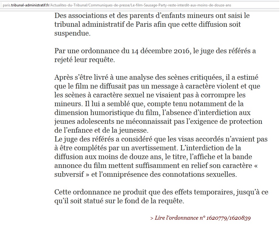 Du coup, le Tribunal administratif de Paris a été amené à donner son avis et le juge des référés a rendu une ordonnance dont le contenu me surprend. Je suis surtout choqué (vous connaissez ma pudibonderie, je m’offusque de peu) qu’on puisse lier le fait que parce que la quasi-totalité du film serait drôle (humoristique), alors la scène de fin, qui comporte des viols ce que la traduction française s’est essayé de gommer, serait également humoristique. Non mais allo !