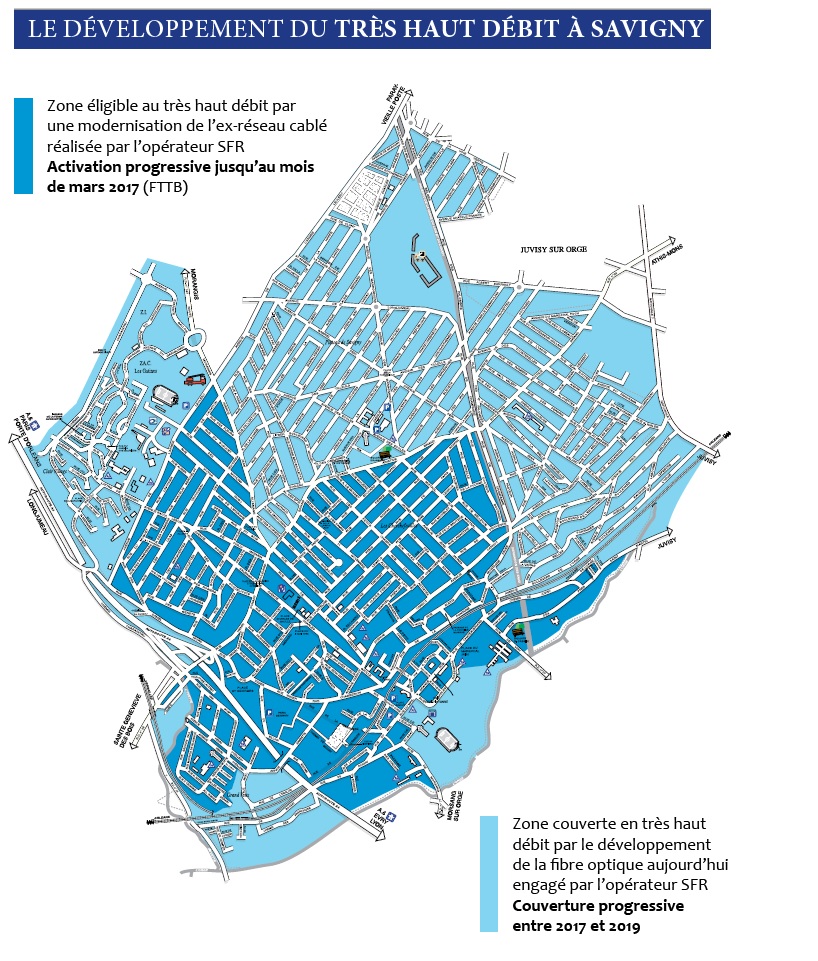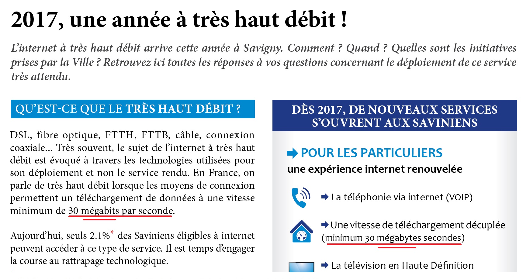 Le maire de Savigny-sur-Orge est fier de nous annoncer que nous serons tous reliés au Très haut débit (THD) d’ici 2019. Pour rappel, le THD commence à partir d’un débit supérieur à 30 mégabits par seconde (à ne pas confondre avec les mégabytes comme nos bons amis qui rédigent le bulletin municipal). Mais en nous installant de la FTTB (Fiber to the building), je doute que SFR puisse tenir ses engagements avant décembre 2017 !