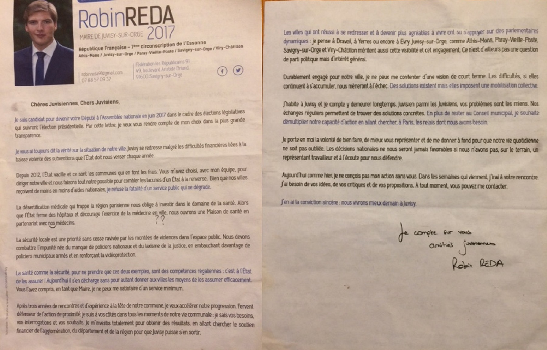 Dans une lettre aux Juvisiens, Robin RÉDA tente de justifier l’abandon de sa mairie s’il était élu député aux législatives, à cause du non-cumul des mandats. Mais il rassure sa population : il mettra bien un fantôme à sa place (on parle beaucoup de Michel PERRIMOND), et il continuera de gérer les affaires. Enfin, s’il en a le temps et l’envie, parce que les problèmes de civisme et de voisinage, ça va un peu mais à la longue…