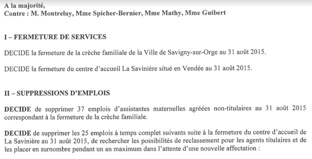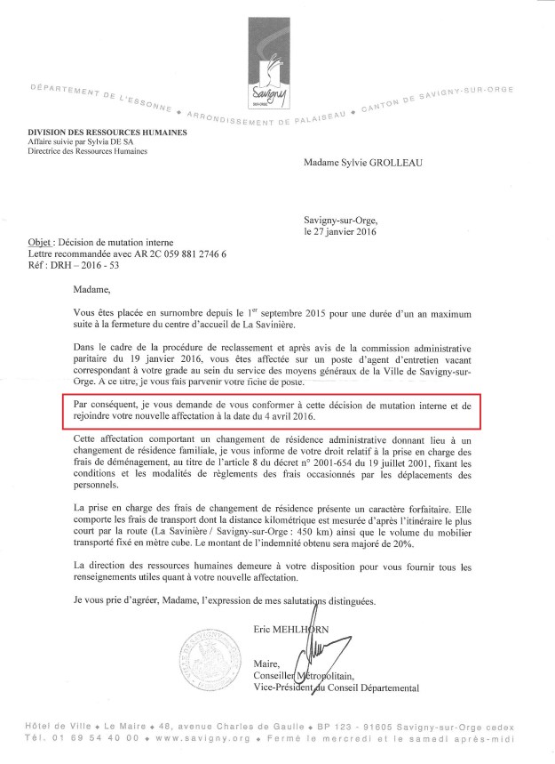 © Cliquez pour agrandir Mais coup de théâtre, le 6 juin 2016, le maire de Savigny retire précipitamment sa décision de mutation. Une décision qu’il prendra néanmoins onze jours à communiquer aux agents… Cela est suivi d’un engagement à ce que les agents soient pris en charge et suivis par le Centre départemental de gestion de Vendée pour leur recherche d’emploi au lieu du CIG de Versailles.
