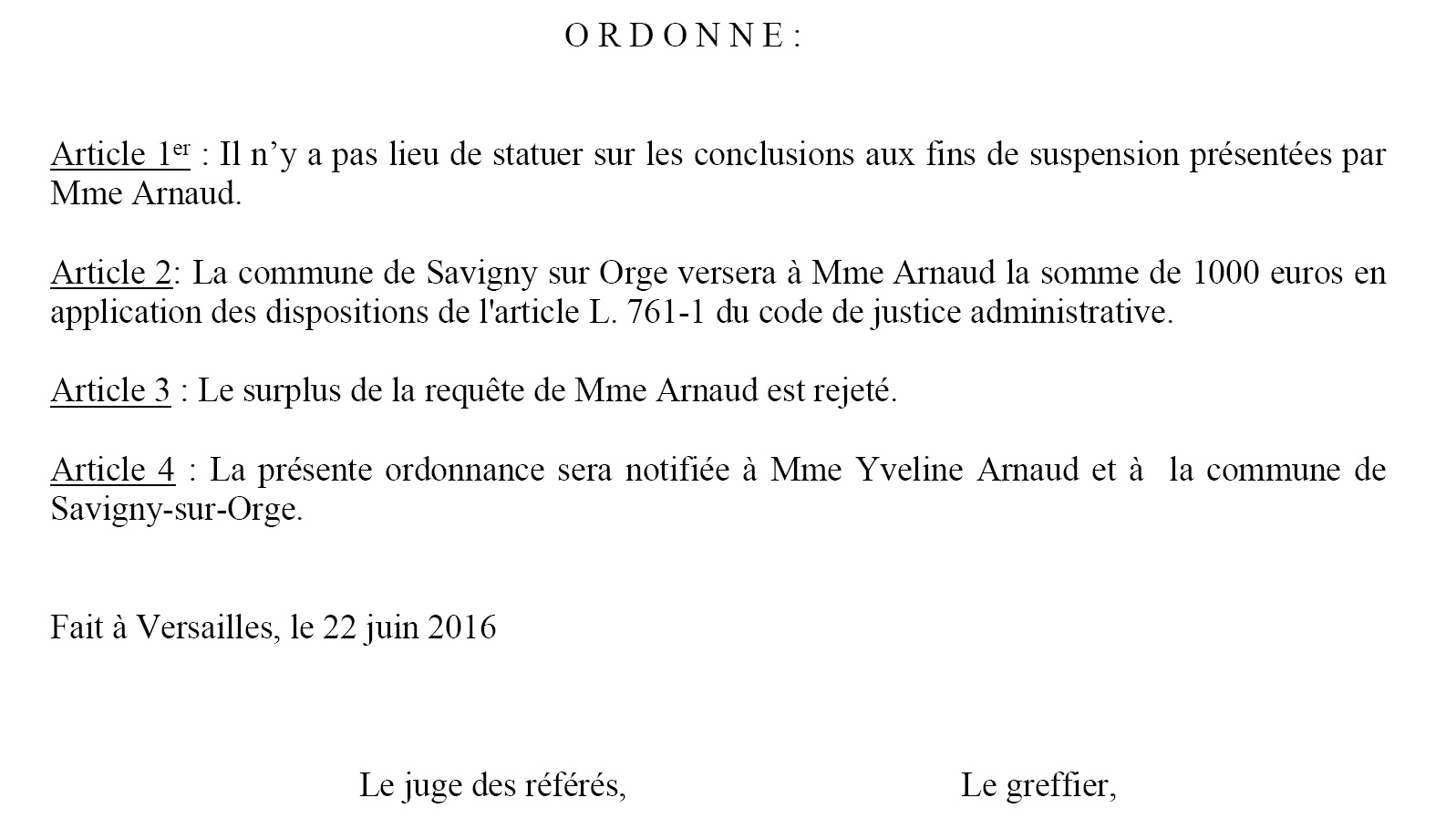 Extrait de l’ordonnance concernant Mme Yveline ARNAUD. Celle de Mme GROLLEAU condamne la Ville à verser la même somme.