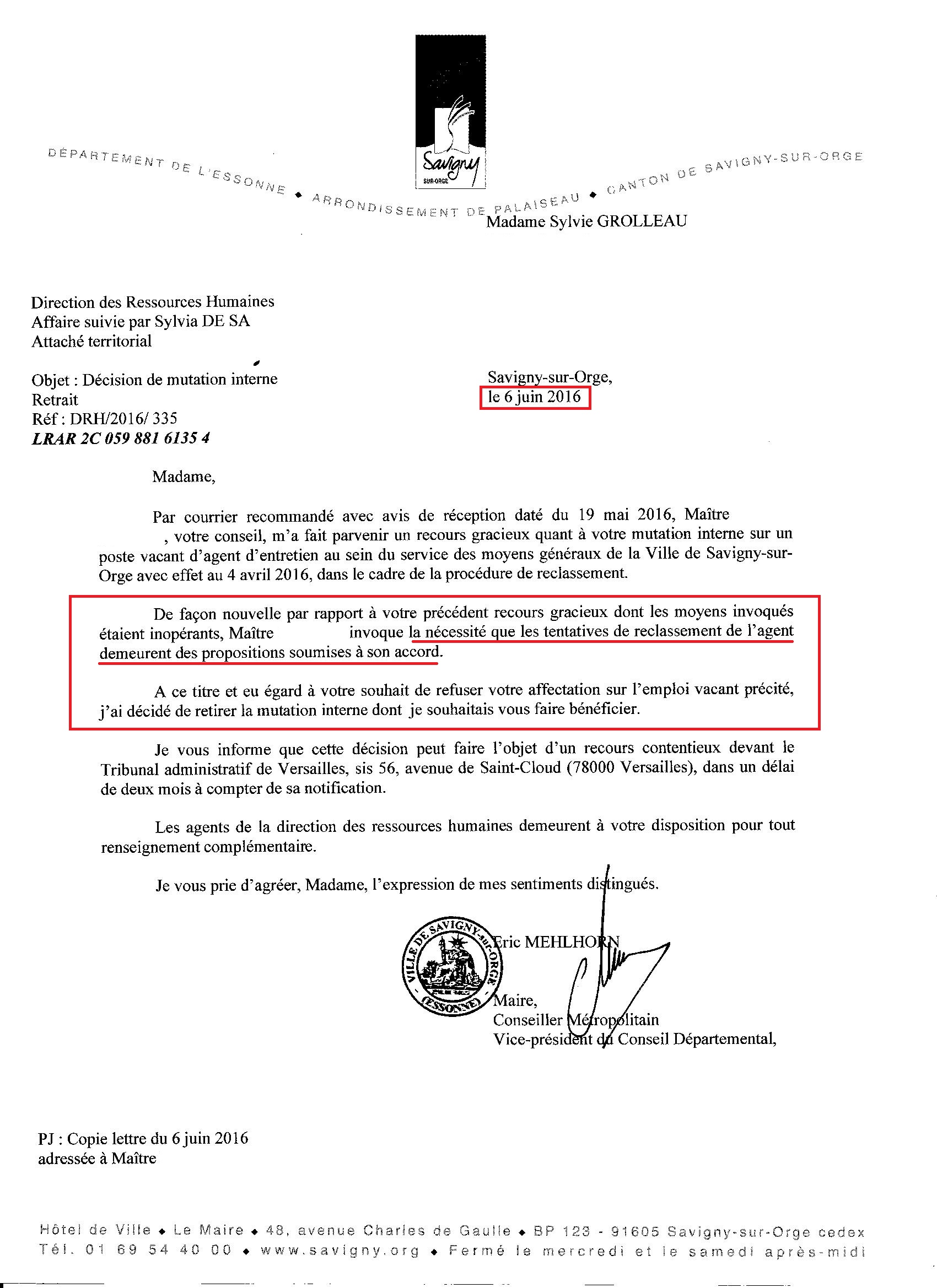 © Cliquez pour agrandir Mais coup de théâtre, le 6 juin 2016, le maire de Savigny retire précipitamment sa décision de mutation. Une décision qu’il prendra néanmoins onze jours à communiquer aux agents… Cela est suivi d’un engagement à ce que les agents soient pris en charge et suivis par le Centre départemental de gestion de Vendée pour leur recherche d’emploi au lieu du CIG de Versailles.