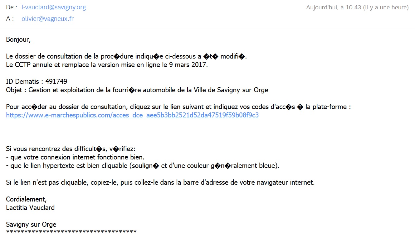 À 07 h 47, ce vendredi 10 mars 2017, je reçois une alerte me signalant que la Ville de Savigny-sur-Orge a publié un appel d’offre (AO). À 09 h 15, je publie un article, à la fin duquel je commente une phrase malheureuse que le rédacteur de cet AO a omis d’enlever de sa maquette. À 10 h 47, nouvelle alerte m’indiquant que le Cahier des clauses techniques particulières, d’où j’avais extrait la phrase, a été modifié : le paragraphe a disparu…