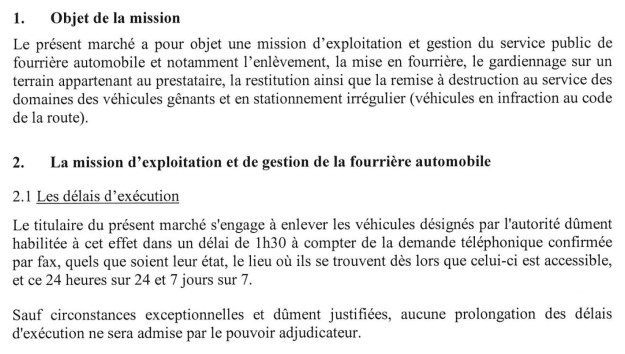 Seuls la Police nationale, ou le responsable de la Police municipale pourront saisir les véhicules en stationnement abusif. Les propriétaires intéressés seront contactés par une lettre recommandé aux frais de la Ville. Ils auront 10 ou 45 jours selon l’état de leur voiture pour aller la réclamer. La Ville laisse 1 heure 30 au prestataire pour intervenir mais ne lui donne pas de prime s’il est plus rapide, ou s’il intervient sans avoir été saisi (par fax, bienvenue en 2017).