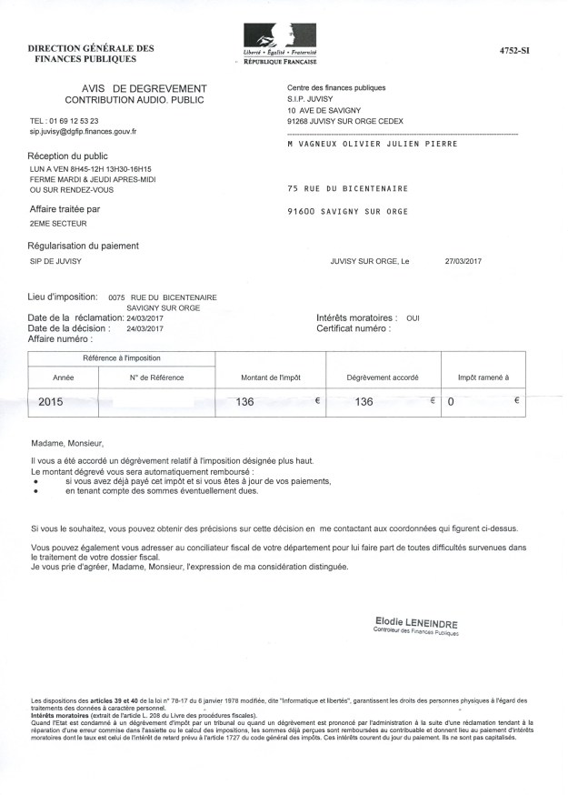 Revenons enfin à notre affaire de redevance dont la morale sera que « Nul n’est censé ignorer la Loi« . Après lecture du courrier, et découverte que je n’avais pas à payer la CAP en 2015, je contacte le service des impôts de Juvisy qui me demande de leur envoyer une copie de ma carte d’étudiant de 2014-2015 (c’est la situation au 1er janvier 2015 qui compte). Une semaine plus tard, j’obtiens le dégrèvement et le remboursement de la somme versée en ignorant la Loi.