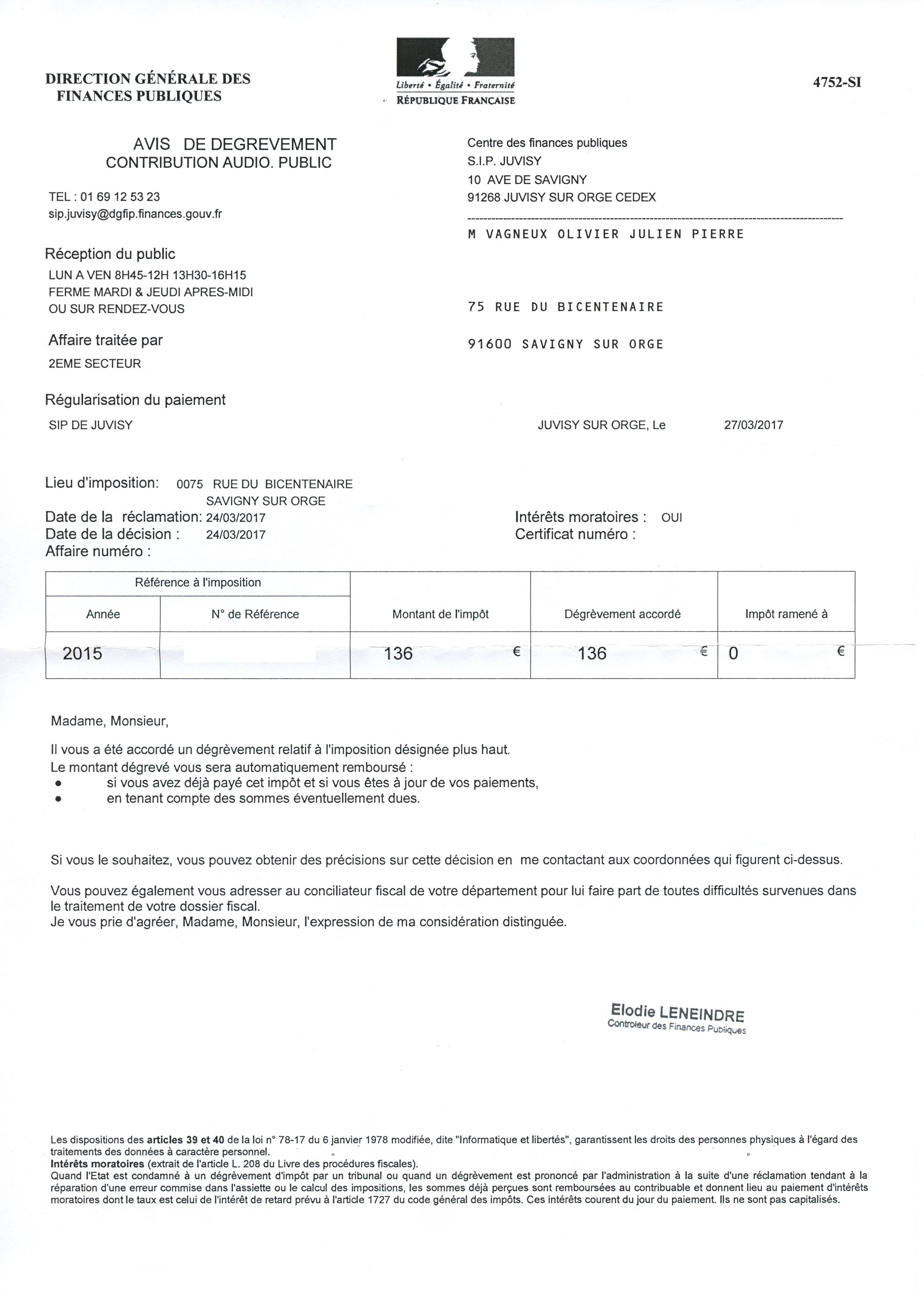 Y a-t-il un seul jour au cours duquel je ne conchie pas la politique d’Éric MEHLHORN, maire de Savigny-sur-Orge ? Je lui reproche notamment de ne pas réaliser d’économies quand il le pourrait. Mais cette rigueur que j’ai pour les autres, je ne l’ai pas toujours pour moi, par exemple quand j’ai payé à tort en 2015 la contribution à l’audiovisuel public. Ce manque d’attention est aujourd’hui réparé puisque je vais être remboursé !