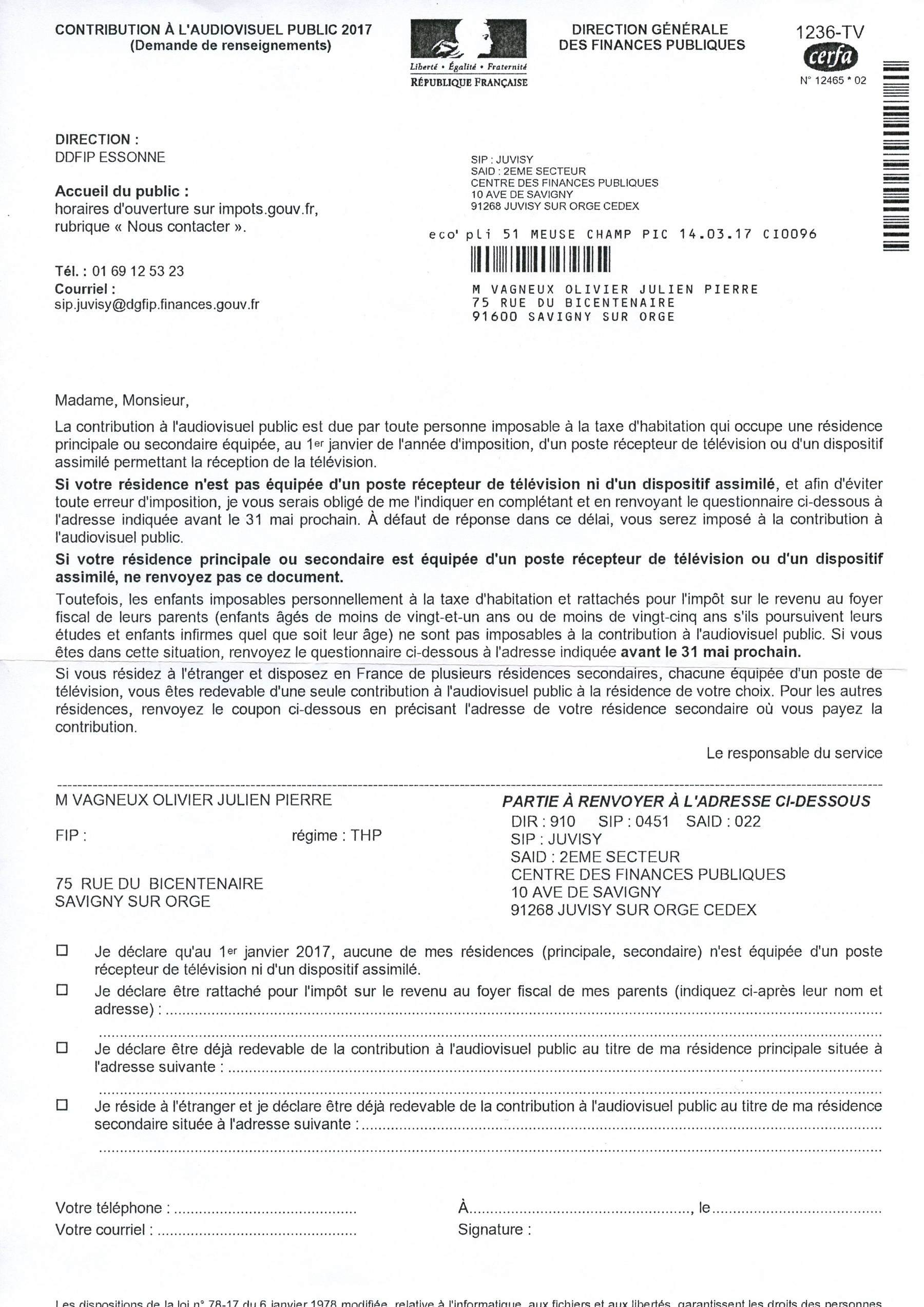Tout a commencé au début du mois de mars 2017 quand j’ai reçu un courrier me demandant si j’étais imposable à la redevance télé. Or, sur le coup, je n’ai pas compris la raison de cet envoi puisque je paye la contribution à l’audiovisuel public depuis 2015. Et en lisant le courrier, j’ai finalement compris qu’on me l’envoyait parce que je ne suis plus rattaché au foyer fiscal de mes parents depuis le 31 décembre 2015, dernier jour de ma dernière année d’études.