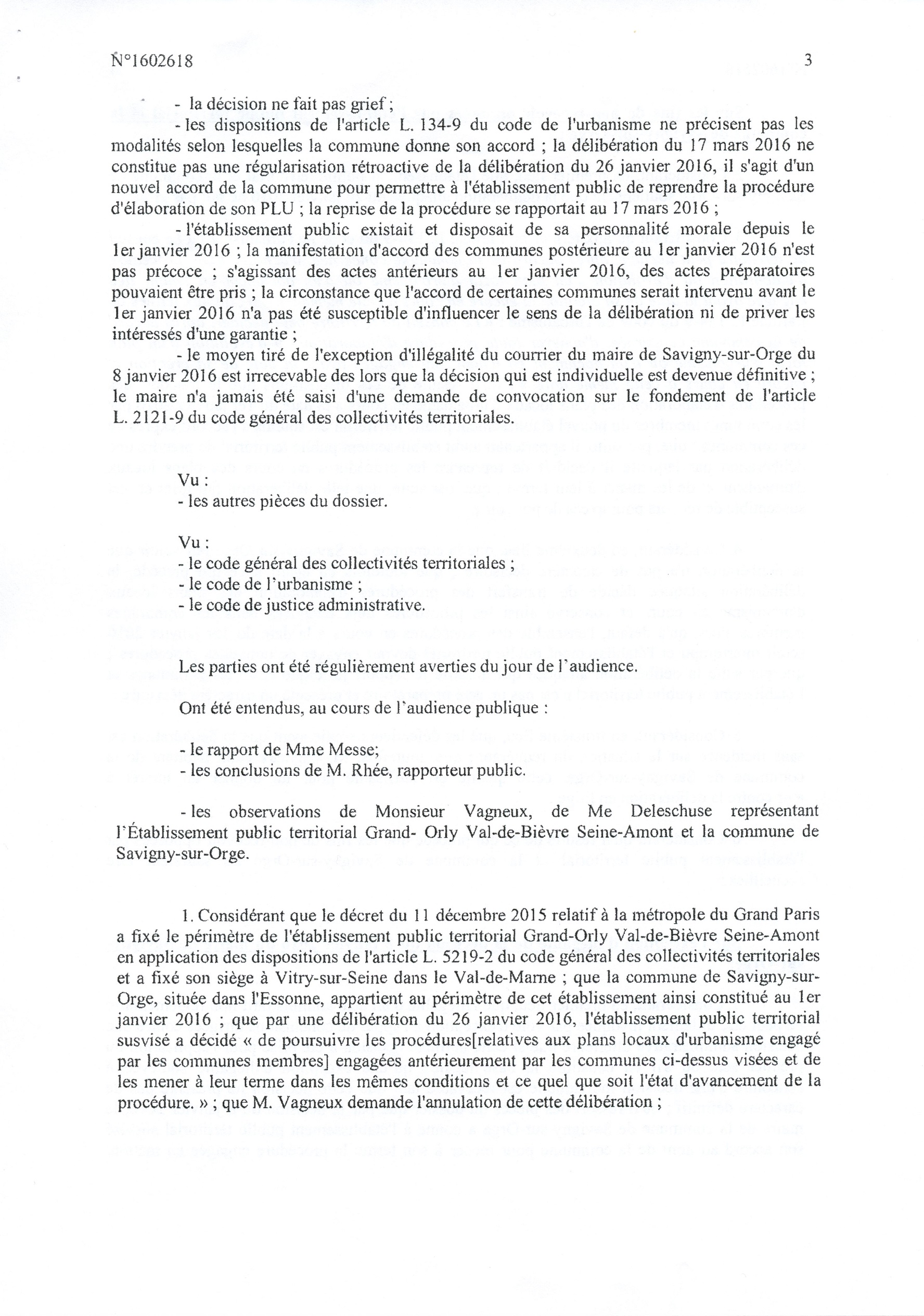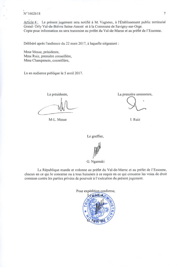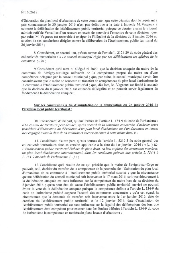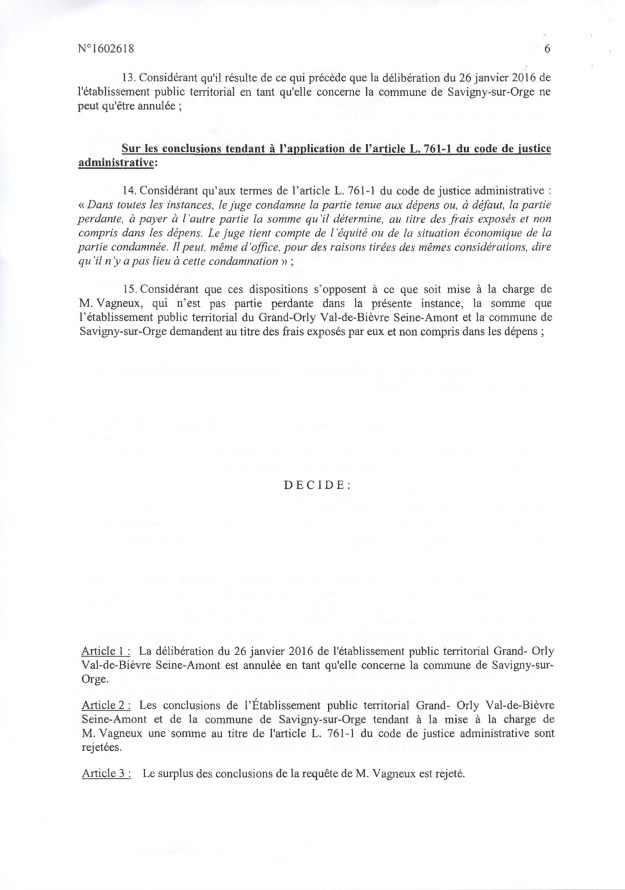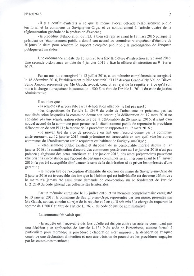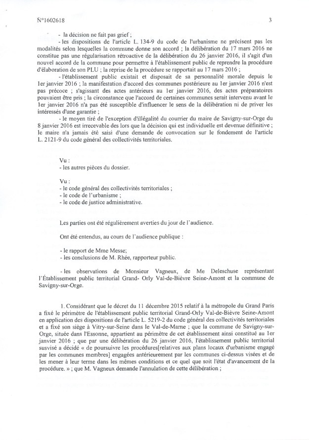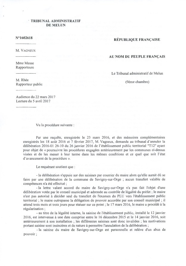 La fameuse délibération du 26 janvier 2016 portant transfert de la compétence PLU à l’EPT est annulée pour la Ville de Savigny uniquement, en première instance. Finalement, cela ne va rien changer d’autant que le PLU a déjà été adopté, mais la Loi aura été respectée, et c’est une satisfaction pour le républicain que je suis. Il faut dire que la Ville de Savigny et l’EPT auraient pu dépêcher un bon avocat pour traiter cette affaire, mais le cabinet SEBAN est tellement débordé…
