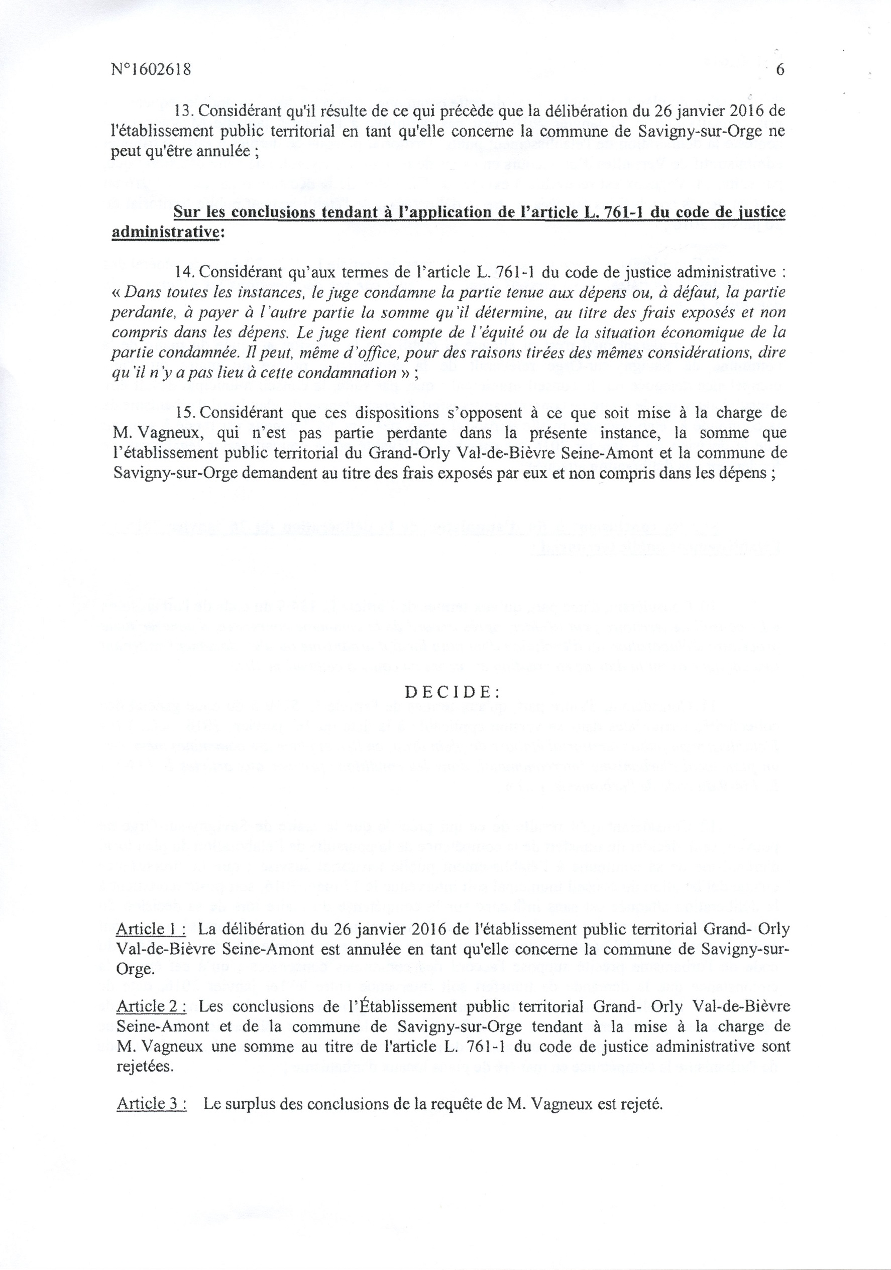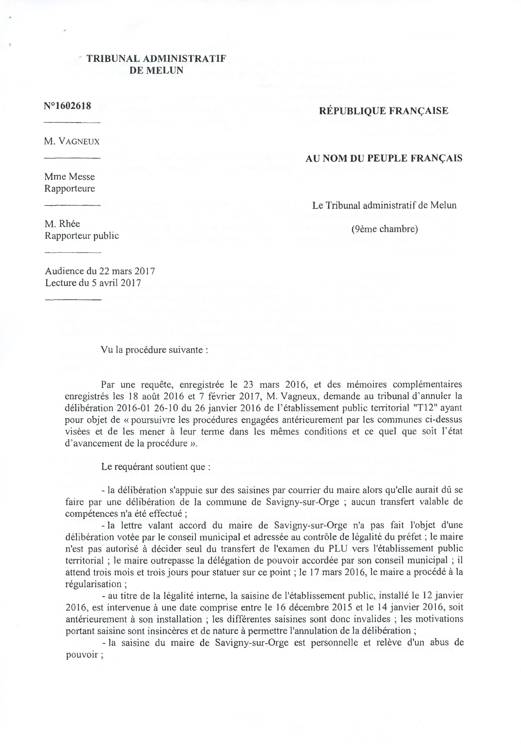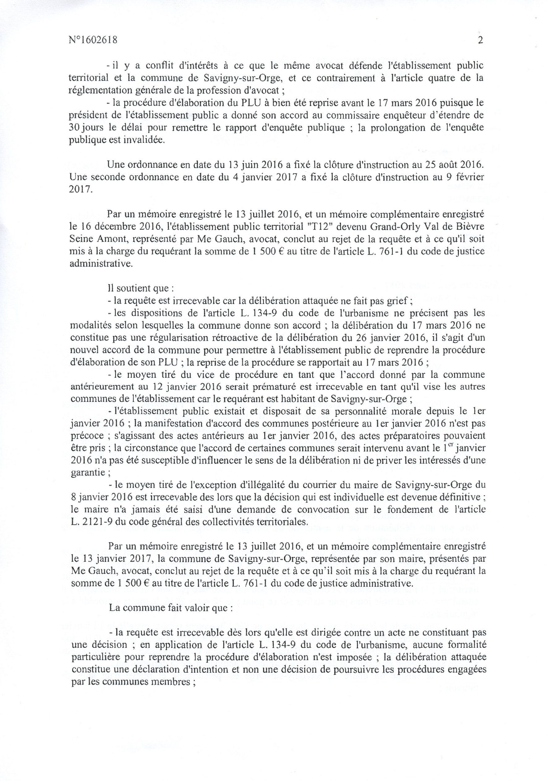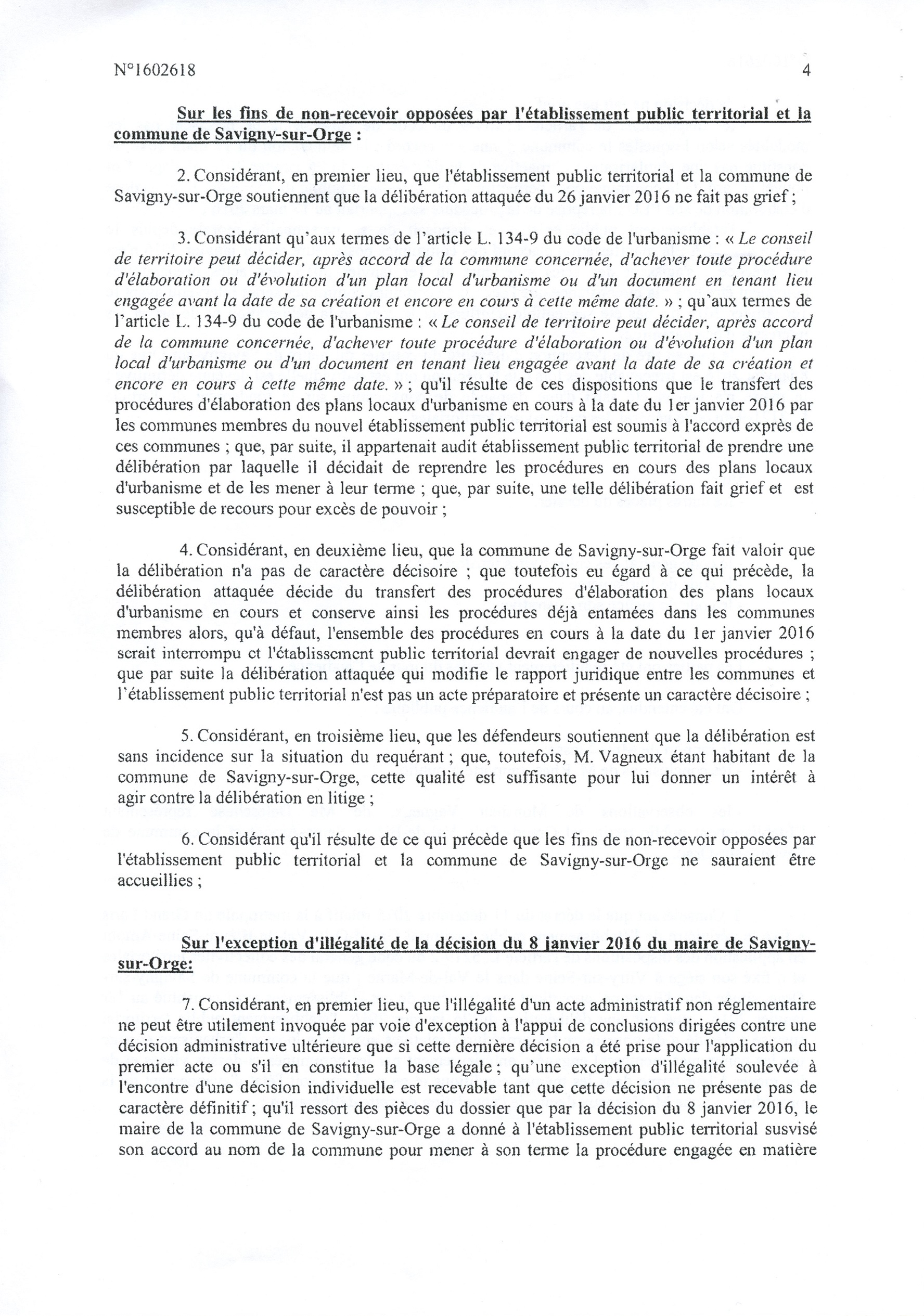 La fameuse délibération du 26 janvier 2016 portant transfert de la compétence PLU à l’EPT est annulée pour la Ville de Savigny uniquement, en première instance. Finalement, cela ne va rien changer d’autant que le PLU a déjà été adopté, mais la Loi aura été respectée, et c’est une satisfaction pour le républicain que je suis. Il faut dire que la Ville de Savigny et l’EPT auraient pu dépêcher un bon avocat pour traiter cette affaire, mais le cabinet SEBAN est tellement débordé…
