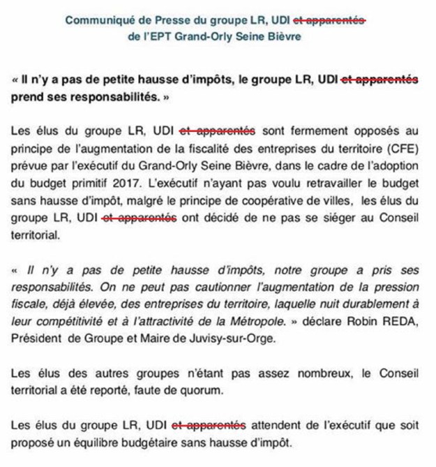 Au cours du Conseil territorial du GOSB du 15 avril 2017, et à la suite de la parution d’un communiqué de presse mensonger envoyé par Robin RÉDA, président du groupe des élus d’opposition, Alain VEDÈRE, maire de Paray-Vieille-Poste, et Raymond CHARRESSON, maire de Rungis, ont fait le choix de se désolidariser, sur ce point uniquement, du groupe auquel ils sont rattachés pour faire valoir leur version des faits et leur liberté de vote !