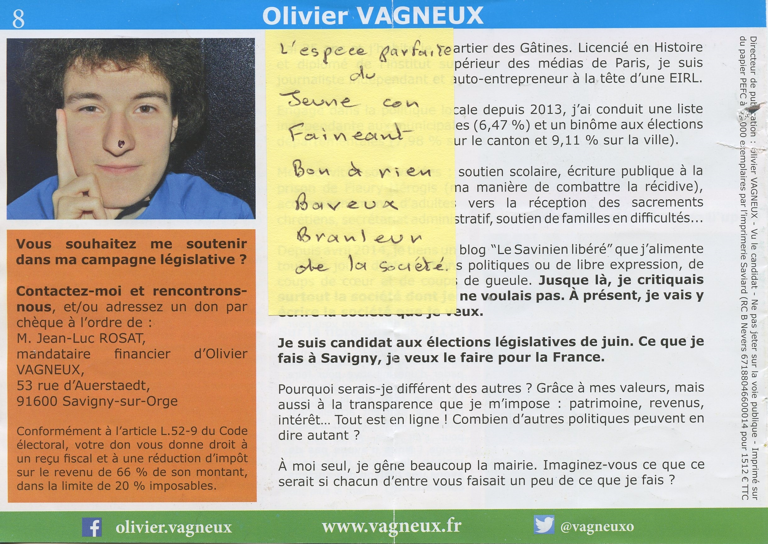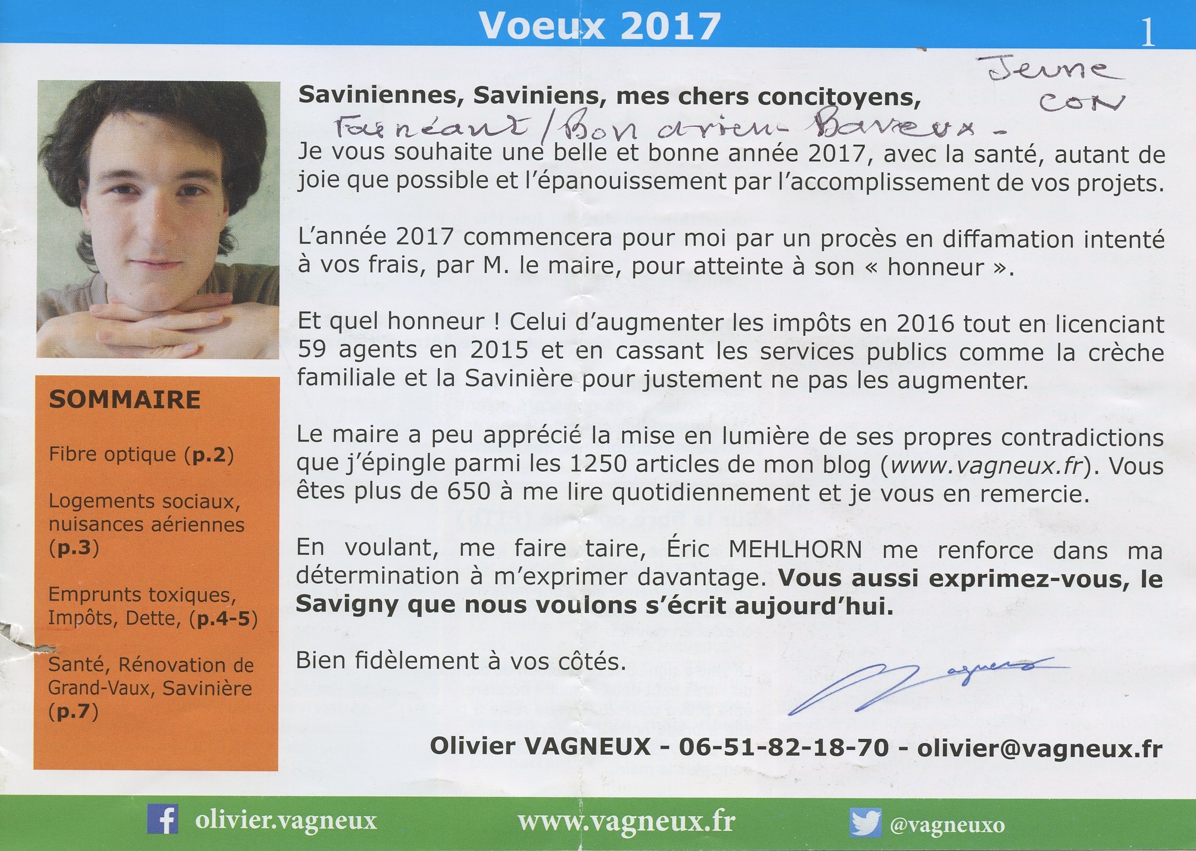 Au courrier de cette semaine, le doux message d’un Savinien qui a pris la peine de conserver mon bulletin de vœux pour me le réadresser, tout en payant un timbre de sa poche. L’extrait du document est accompagné d’une série d’insultes, assez courtes en portée. Pour preuve, les insultes de la première page sont réécrites en deuxième page, preuve que notre détracteur devait quelque peu manquer d’imagination…