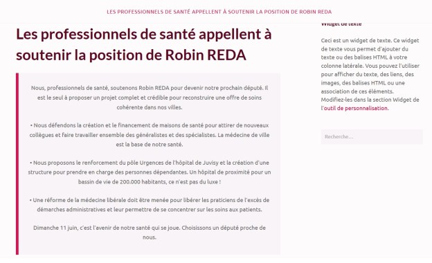 Vu l’importance prise par le thème de la sauvegarde de l’hôpital, enjeu majeur de cette campagne législative, et l’imprécision des différents documents proposés par le candidat RÉDA, alors je l’accuse de répandre des fausses informations dans le but de renforcer le volet sanitaire de son programme, que je trouve personnellement discutable pour ne pas dire léger car incomplet. En effet, à aucun moment, le candidat RÉDA ne parle par exemple du numerus clausus…