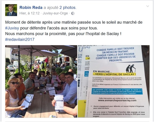 En effet, tant sur un site dédié de RÉDA qui s’appelle « enmarchepoursaclay.com« , que sur un tract distribué ce samedi 27 mai et ce dimanche 28 mai, portant les mentions légales du candidat RÉDA, il est indiqué que « les professionnels de santé appellent à soutenir la position de Robin RÉDA ». Sans plus de précision, de nature à semer le doute dans l’esprit du public, qui pourrait ainsi penser que tous les médecins (pour ne citer qu’eux) de la circonscription le soutiennent.