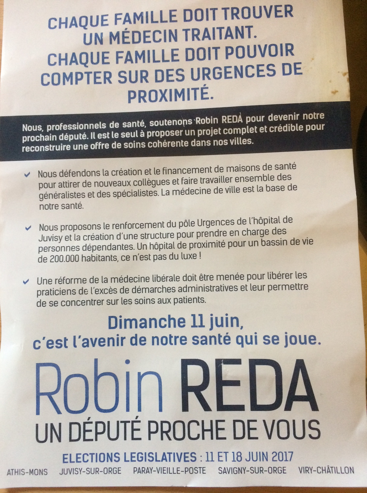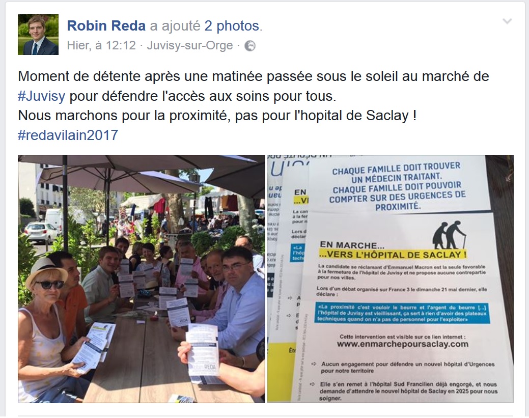 Vu l’importance prise par le thème de la sauvegarde de l’hôpital, enjeu majeur de cette campagne législative, et l’imprécision des différents documents proposés par le candidat RÉDA, alors je l’accuse de répandre des fausses informations dans le but de renforcer le volet sanitaire de son programme, que je trouve personnellement discutable pour ne pas dire léger car incomplet. En effet, à aucun moment, le candidat RÉDA ne parle par exemple du numerus clausus…