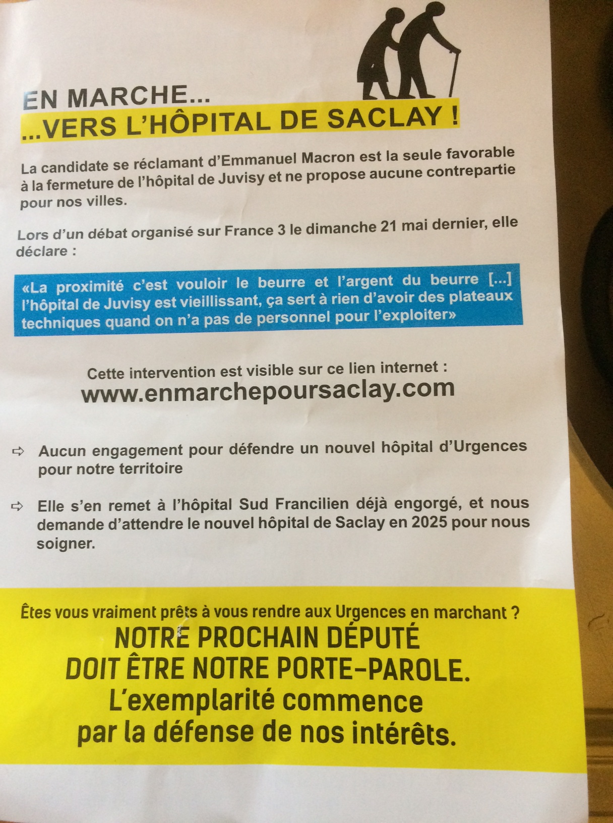 En effet, tant sur un site dédié de RÉDA qui s’appelle « enmarchepoursaclay.com« , que sur un tract distribué ce samedi 27 mai et ce dimanche 28 mai, portant les mentions légales du candidat RÉDA, il est indiqué que « les professionnels de santé appellent à soutenir la position de Robin RÉDA ». Sans plus de précision, de nature à semer le doute dans l’esprit du public, qui pourrait ainsi penser que tous les médecins (pour ne citer qu’eux) de la circonscription le soutiennent.