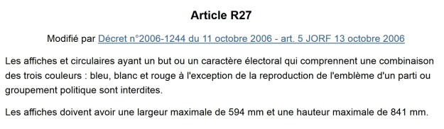 L’article R.27 du Code électoral interdit l’utilisation juxtaposée de trois couleurs : le bleu, le blanc et le rouge. Il fût d’ailleurs une époque où c’était un bleu précis tout comme un rouge spécifique, mais ce temps là est terminé. Bref, seuls les emblèmes de partis ou de groupements politiques ont le droit d’être ainsi coloré. Or, qu’est-ce que je ne suis pas, sinon un groupement politique, à savoir deux personnes qui se présentent ensemble pour défendre un programme ?
