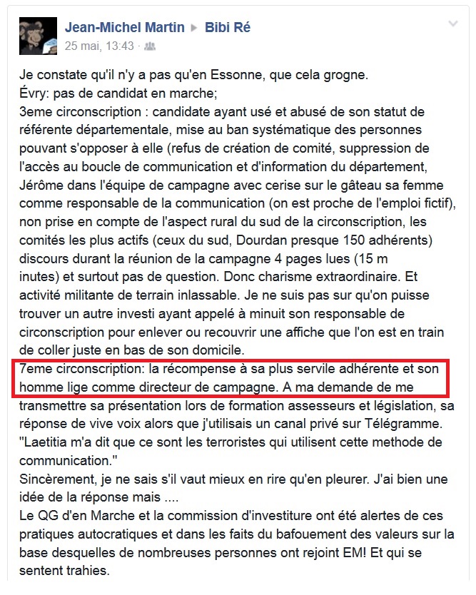 Deuxièmement, je lis ce message trouvé sur Facebook, qui n’est d’ailleurs pas très gentil pour Muriel KERNREUTER. Il est intéressant en ce qu’il dénonce le fonctionnement d’En marche en Essonne.