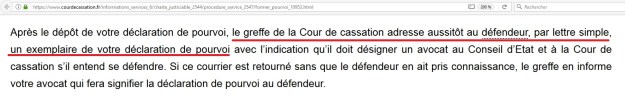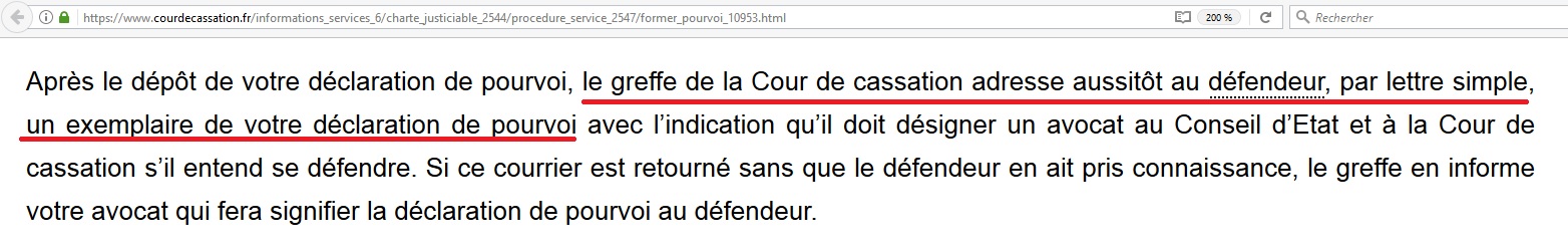 Pourtant, dans la charte du justiciable, qui se trouve sur le site de la Cour de cassation, il est précisé que c’est le greffe de la Cour de cassation qui adresse un exemplaire du pourvoi…