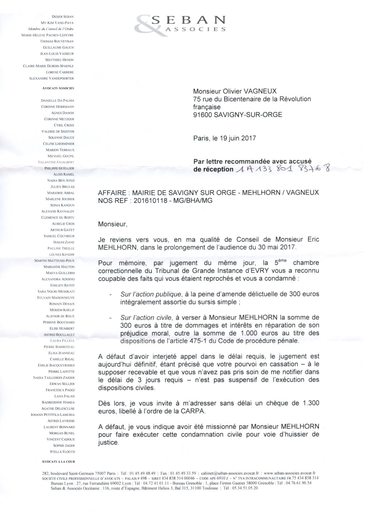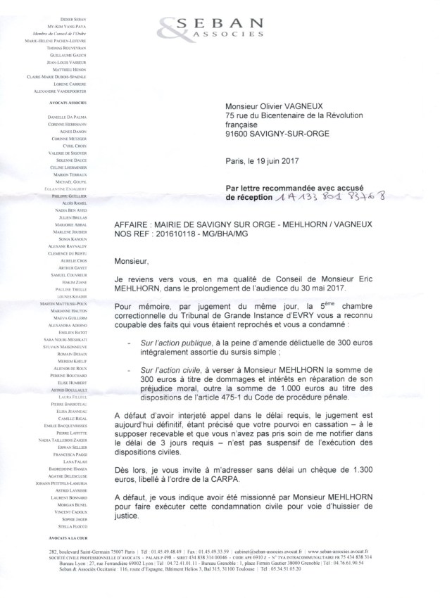 J’ai reçu ce jour (20 juin 2017) un courrier du cabinet SEBAN qui trouve que je ne paye pas assez vite les 1300 euros (ma condamnation pour diffamation).
