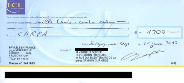 Pièce jointe : Chèque de 1300 euros à l’ordre de la CARPA