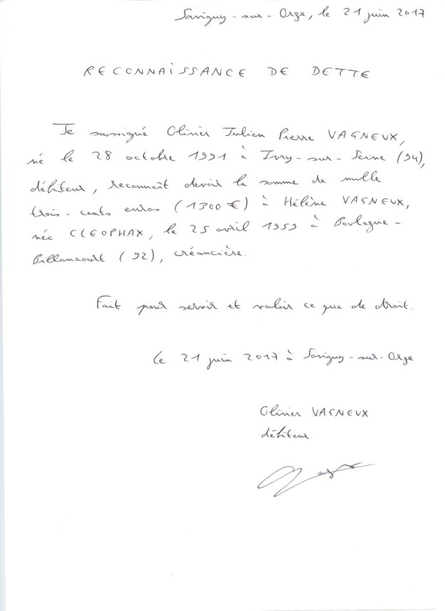 Afin de vous éviter de devoir faire exécuter cette condamnation civile « pour voie d’huissier de justice » (cf votre courrier du 19 juin 2017), je vous prie de trouver joint à ce courrier un chèque de 1300 euros libellé à l’ordre de la Caisse autonome des règlements pécuniaires des avocats.
