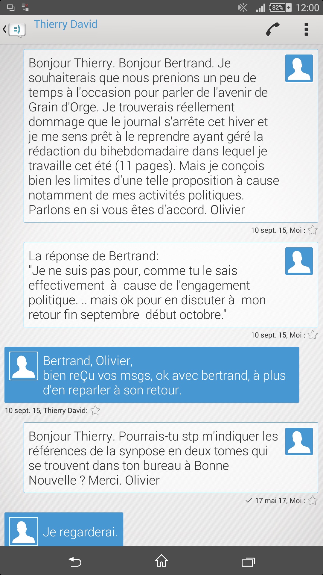Je voudrais donc simplement faire profiter au plus de monde possible d’un échange de SMS avec le prêtre responsable de secteur, le Père Thierry DAVID, et Bertrand WITTMANN, propriétaire du journal, prouvant que je me suis proposé de reprendre le journal, ce qui ne signifie pas pour autant que c’était une bonne idée, et que le journal aurait davantage perduré.