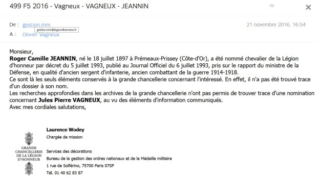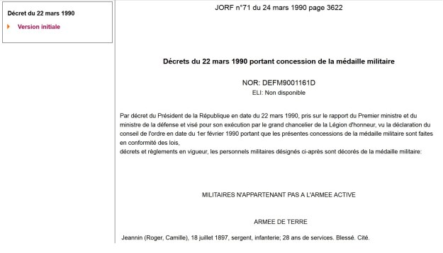 Le Bureau de la Légion d’honneur a su me retrouver la date de sa décoration de chevalier de Légion d’honneur, en tant qu’ancien combattant de 14-18, survivant en 1990. J’ai sinon trouvé trace de la médaille militaire qu’il a également reçu, selon le Journal officiel, bien que le Bureau de la Légion d’honneur n’en ait justement trace… Je sais qu’il avait été gazé et qu’il en ait gardé des difficultés respiratoires qui ne l’ont pas empêché de mourir à 97 ans.