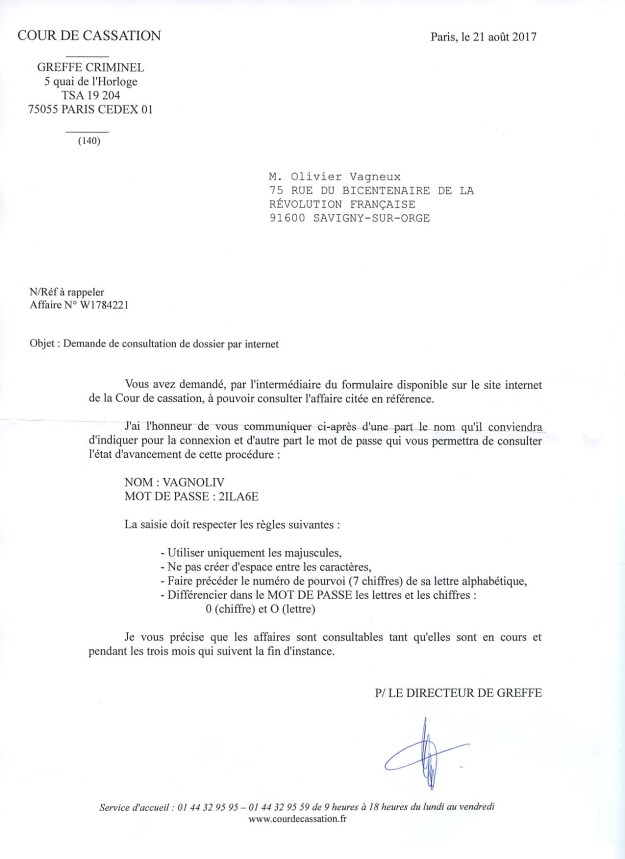 1) Le courrier m’indiquant mes identifiants m’a été envoyé par le greffe criminel.
