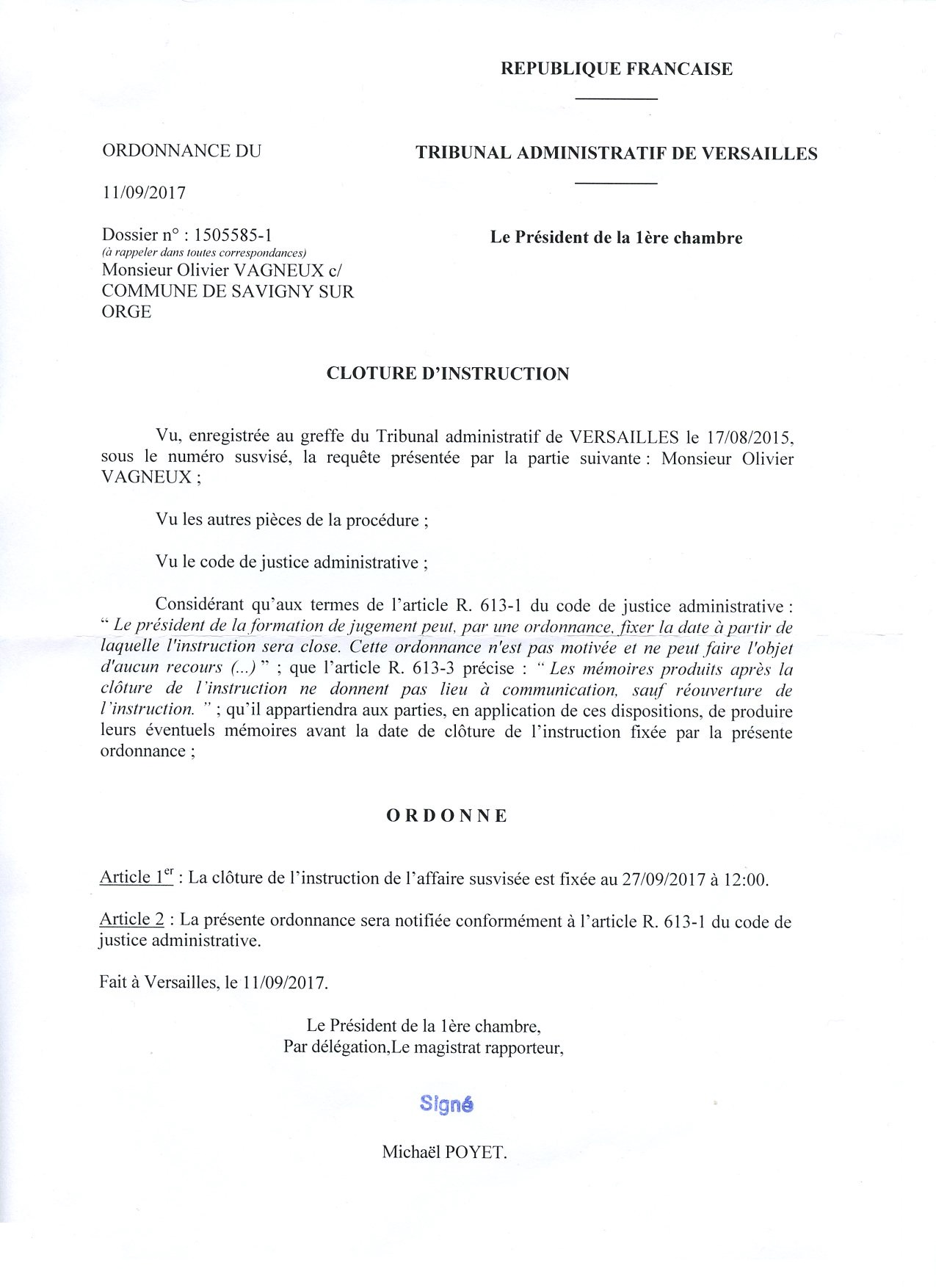 La clôture d’instruction est donc fixée pour le 27 septembre. Nous allons donc envoyer une dernière salve en réplique dans le courant de la semaine prochaine. Je crains que cela rouvre le dossier, mais j’ai pour l’instant confiance dans l’issue du procès.