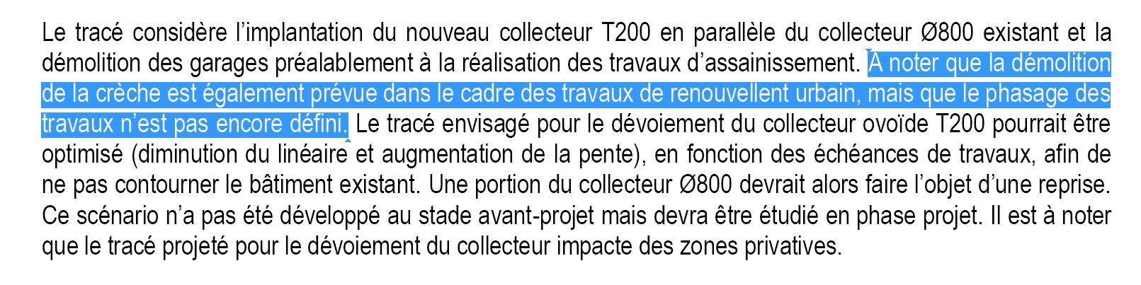 Mais au-delà des deux solutions de travaux envisagées, et nous comprenons bien qu’il serait plus simple pour le SIAHVY d’aller tout droit, plutôt que de contourner la crèche, il convient surtout de s’interroger sur cette affirmation que la crèche va être démolie.