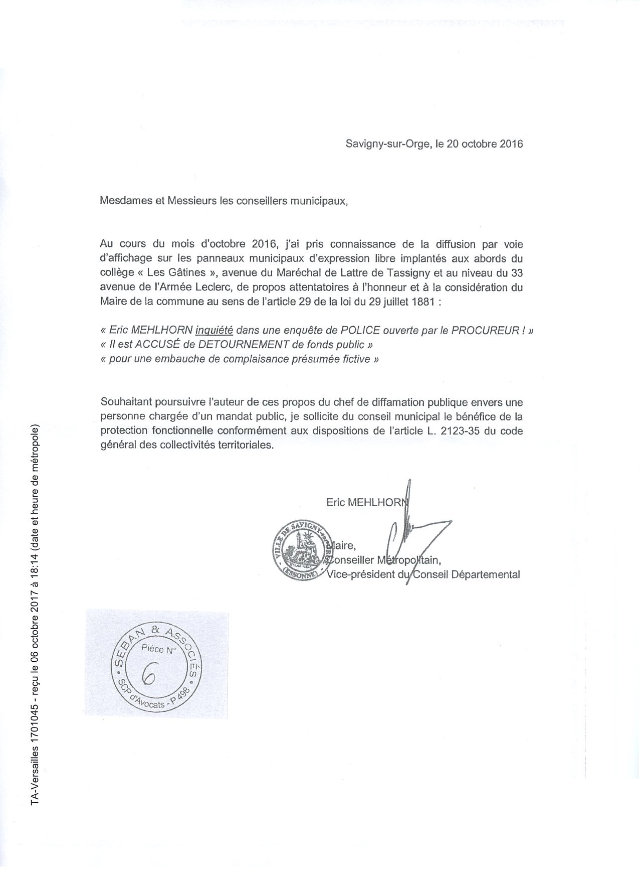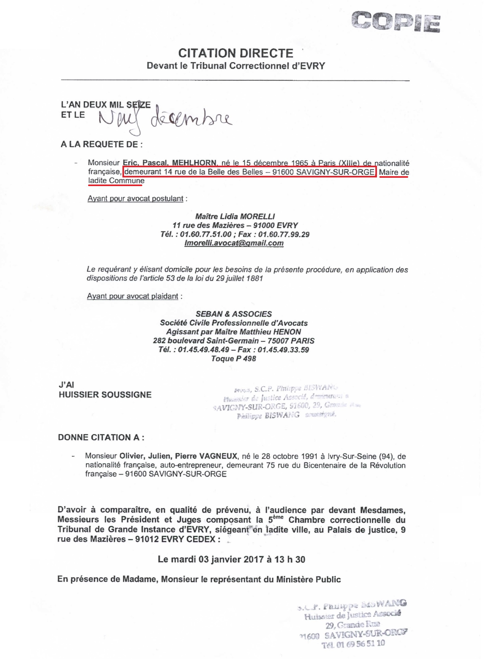 Éric MEHLHORN est maire de Savigny, et il estime avoir été diffamé dans le cadre de sa fonction, par rapport à des actes de gestion de maire.