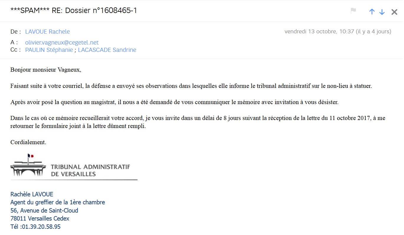 En ce mercredi 18 octobre 2017, j’annonce avoir pris la difficile décision (c’est surtout dur pour mon égo) de me désister purement et simplement de ma requête n°1608465-1 demandant (1) l’annulation de la première protection fonctionnelle octroyée au maire de Savigny-sur-Orge, et (2) le remboursement des dépenses effectuées au moyen de celle-ci.
