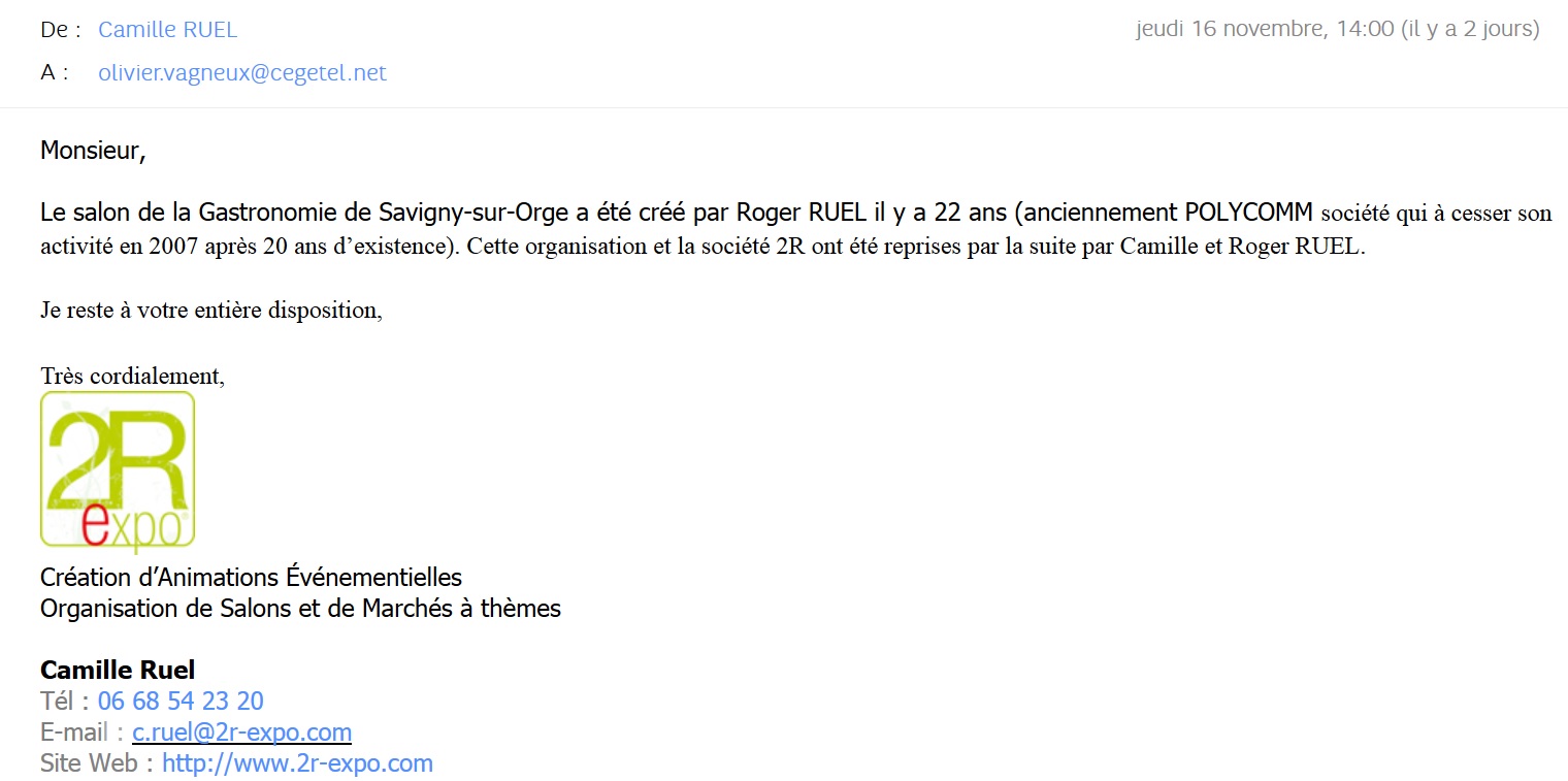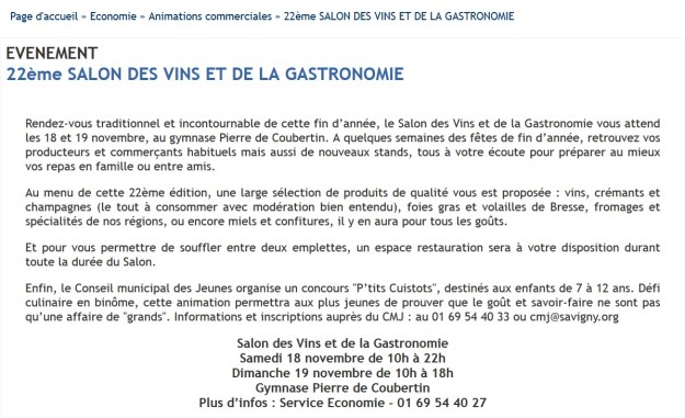Pour la première fois de son histoire, la Ville de Savigny-sur-Orge organise seule son salon de la gastronomie ; lui permettant d’un côté d’économiser quelques milliers d’euros qu’elle donnait à la société 2R expo pour préparer. Mais de l’autre, la Ville y perd en termes d’avantages en nature comme par exemple si vous vous souvenez, celui qu’elle incluait au marché pour que la société organisatrice lui réserve cinquante couverts…
