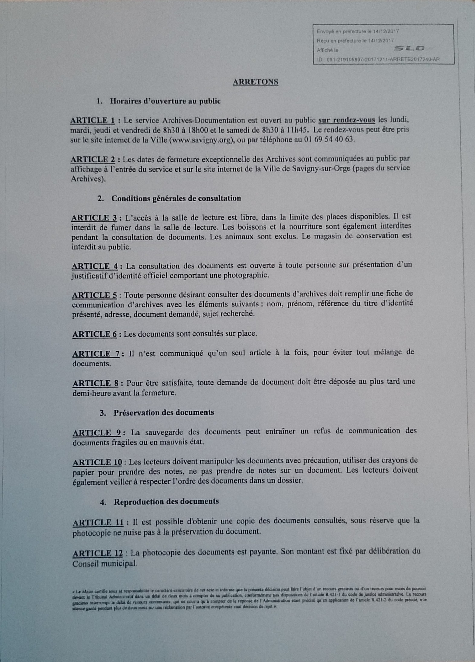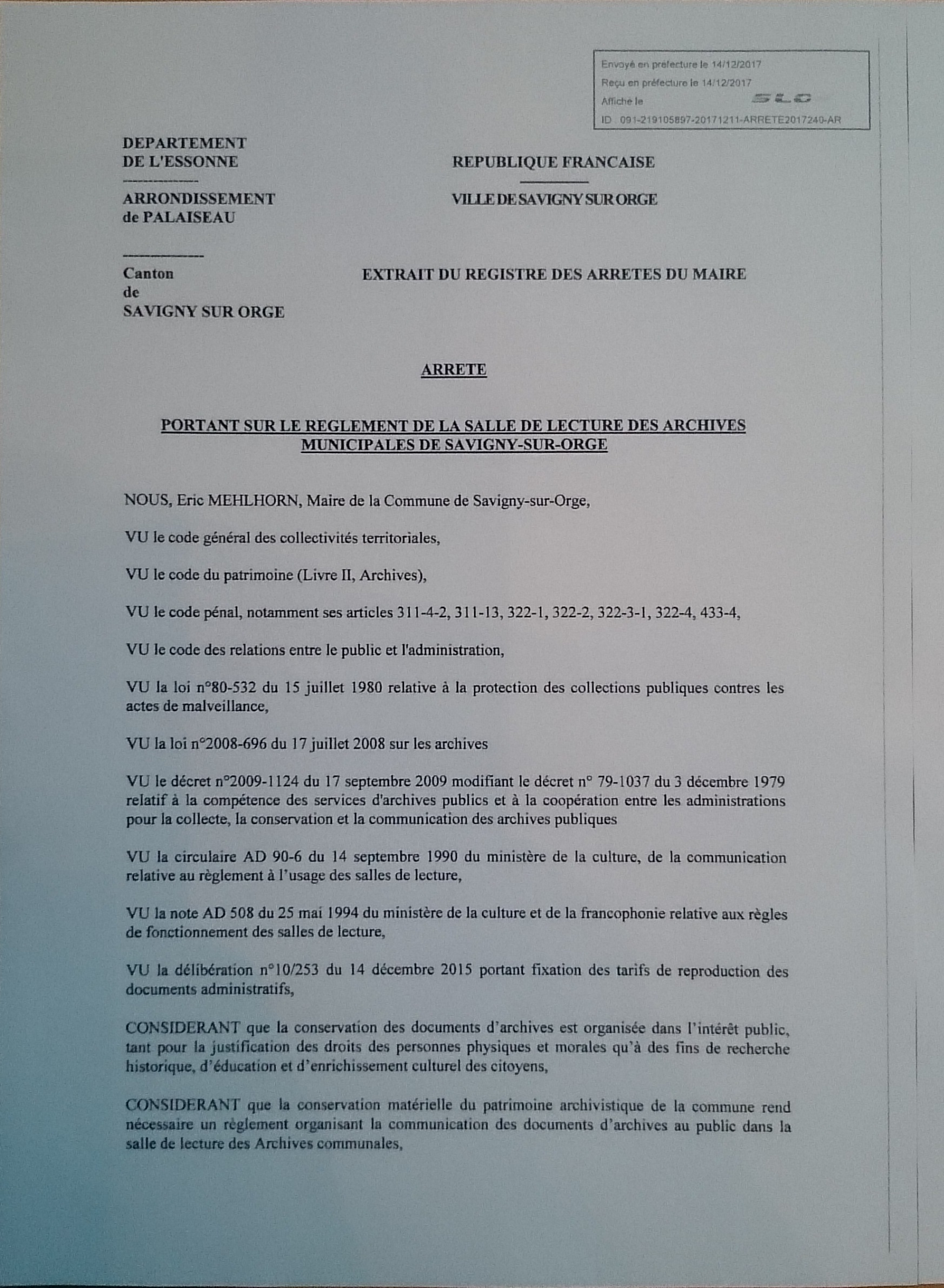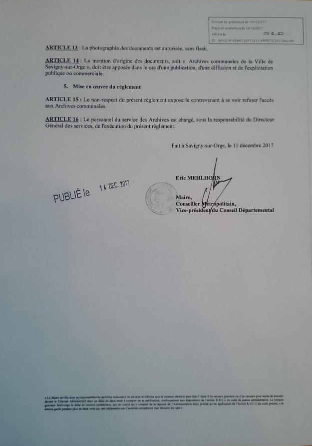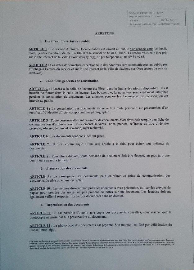 La Ville de Savigny-sur-Orge s’est dotée d’un règlement intérieur pour sa salle de lecture des archives communales ce 14 décembre 2017.