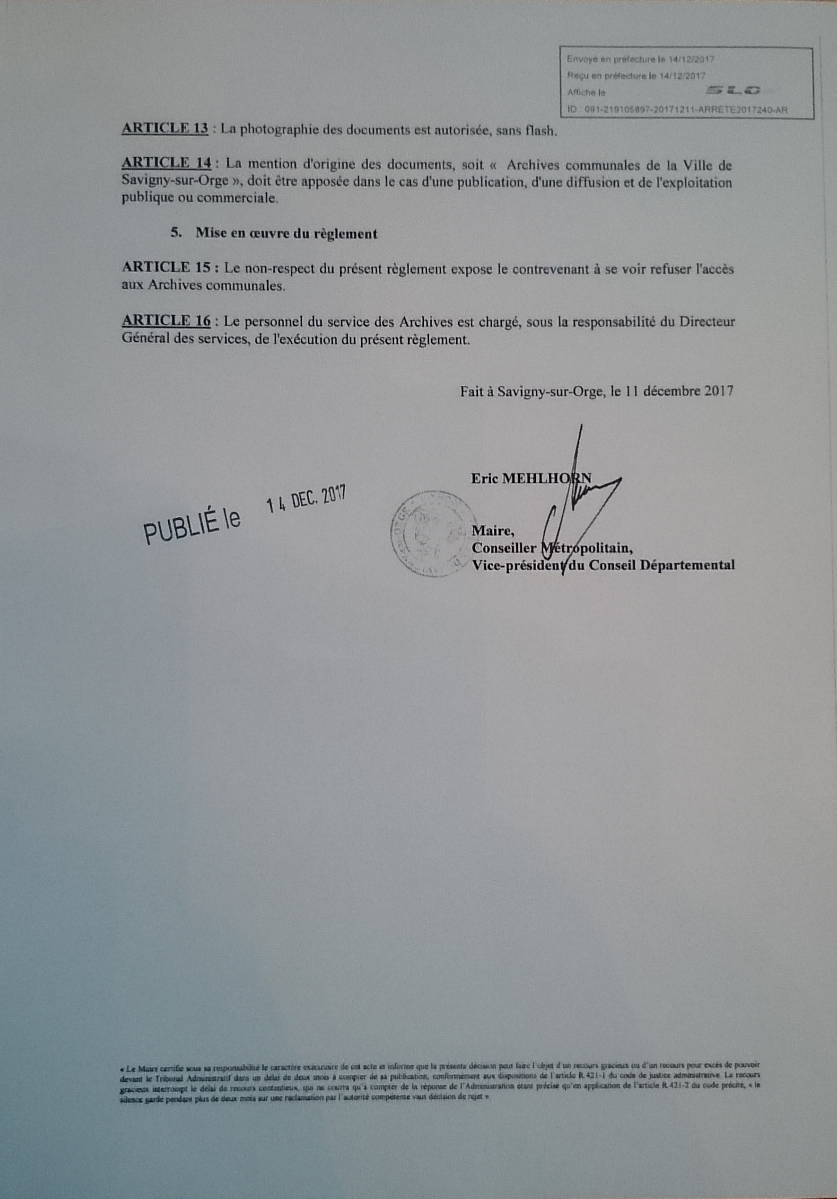 2) de me communiquer un exemplaire dématérialisée du règlement de la salle de lecture des archives communales (que la Ville me refuse jusqu’à présent), afin que je le défère personnellement et au plus vite devant le Tribunal administratif ; à moins que vos services acceptent de donner suite à un recours hiérarchique que je pourrais sinon vous adresser.