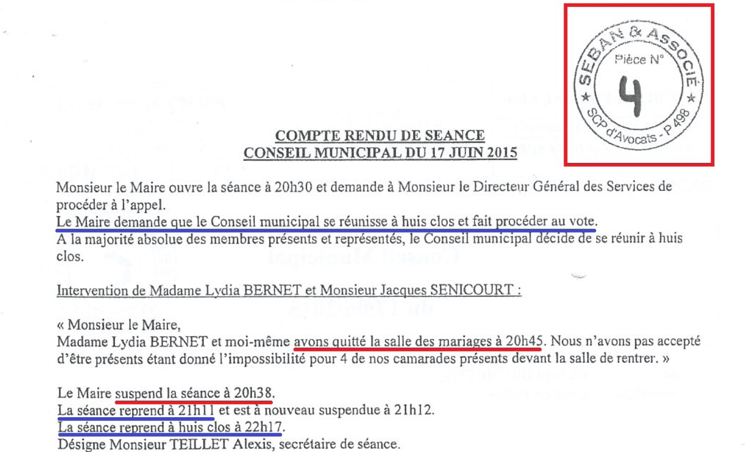 Il y a eu beaucoup de bêtises de faites de la part de la municipalité, allant jusqu’au faux en écriture publique suivant. Soi disant par exemple que cette gauche annoncerait avant 20 h 38 qu’elle serait partie à 20 h 45 !!! (Le problème est que la gauche a validé ce compte-rendu au conseil municipal suivant, dont n’importe qui peut pourtant se rendre compte qu’il est faussé !)