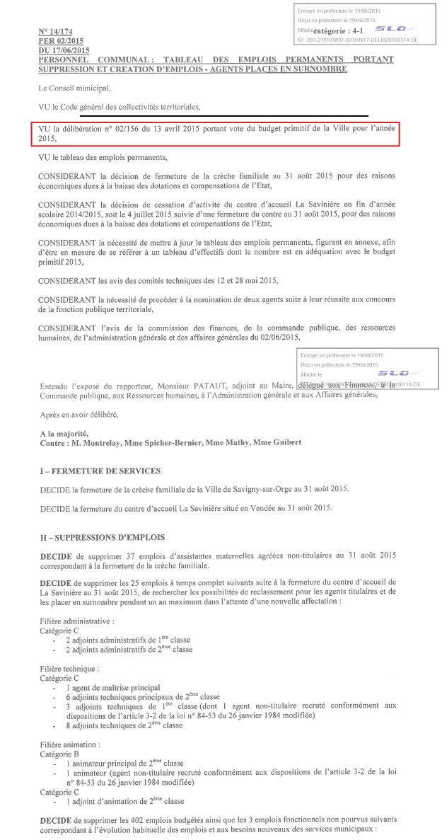 Aussi parce que tant cette même opposition, que les citoyens réunis dans le collectif Sauvons l’enfance de Savigny, ont obtenu l’annulation de la délibération n°02/156 du 13 avril 2015 portant vote du budget primitif 2015, nous devrions pouvoir obtenir l’annulation de toutes les délibérations sur le fondement (le visa) desquelles ces actes ont été pris !