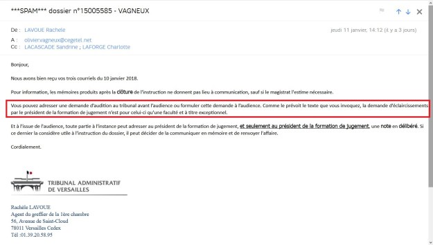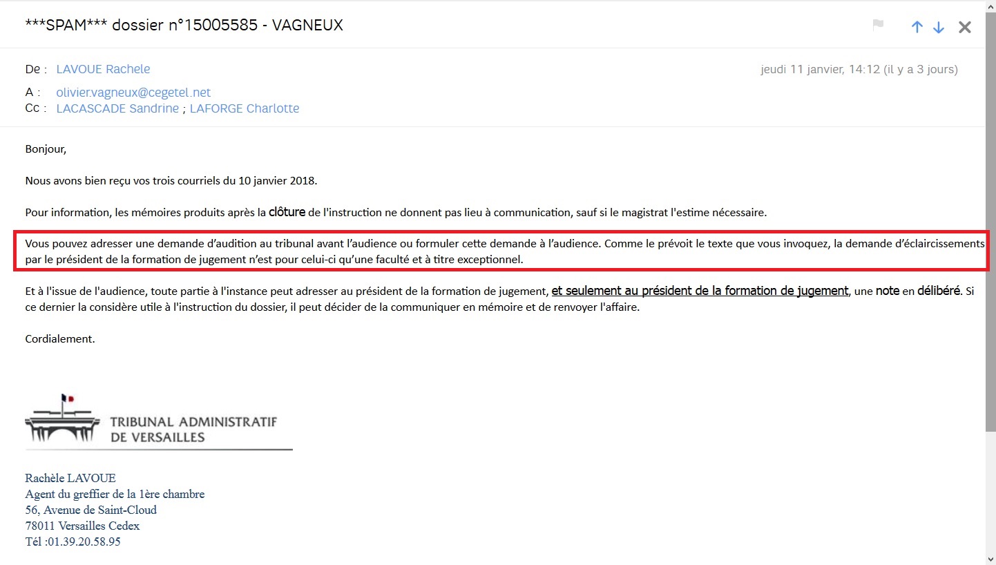 À l’issue de l’audience, et si celle-ci ne m’est pas favorable ou que le sujet n’aura pas été évoqué, j’enverrai une note en délibéré au président de la 1ère chambre pour l’informer d’un nouveau moyen de légalité interne propre à l’annulation de la délibération avec l’annulation du budget 2015 prévoyant et justifiant la fermeture des services.