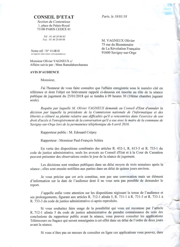 Ici, je conteste la décision de la présidente de la CNIL de clôturer une plainte contre le maire de Savigny, lequel enregistrait nos conversations sans déclaration officielle.