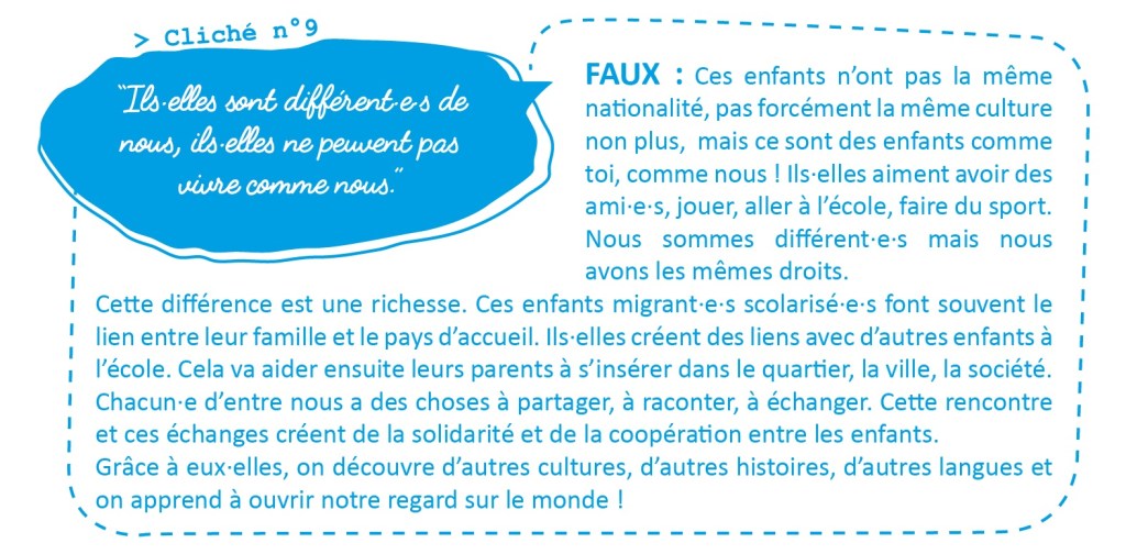 Tout n’est cependant pas à jeter dans ce livret, car pour une fois, les différentes définitions sont plutôt correctes. Et que ça explique bien que le choix de migrer des parents ne rend pas responsables les enfants, et que tous doivent considérer qu’ils ont les mêmes droits. Mais c’est rapidement chiant parce que c’est politique, c’est bienpensant, c’est gauchisant, c’est de parti pris, et ça bourre les crânes des jeunes qui n’ont pas un grand regard critique.