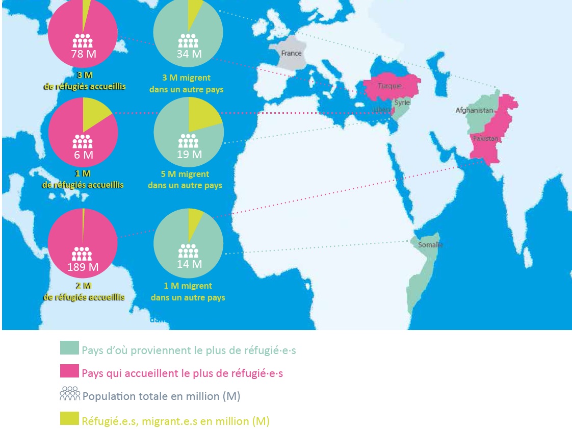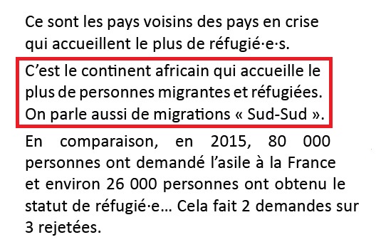 Le texte suivant est en contradiction avec la précédente carte, qui veut nous montrer que l’immigration se fait d’abord dans le pays voisin du sien, sur laquelle l’Afrique ne présente pas de pays accueillant des réfugiés (bien qu’elle mette la Somalie en pays de départ).