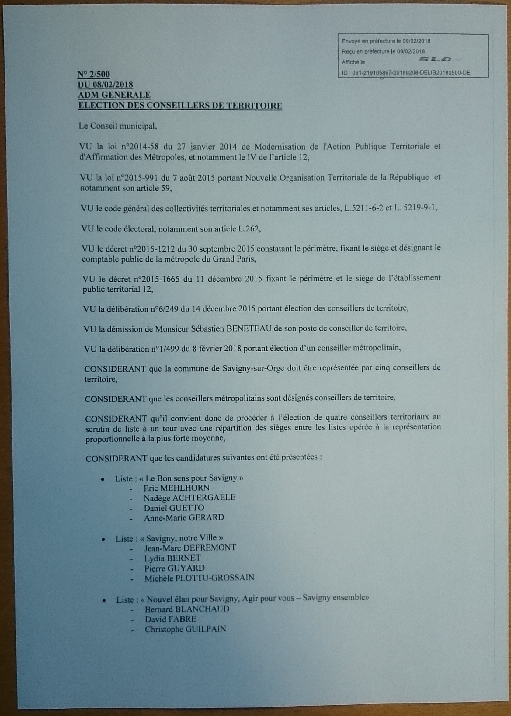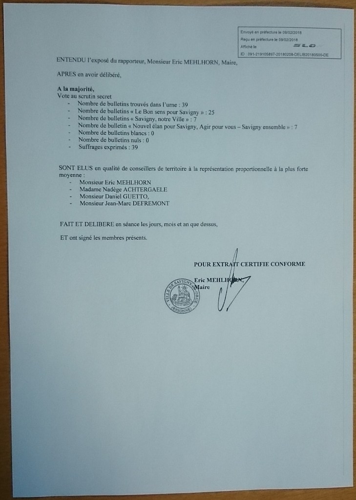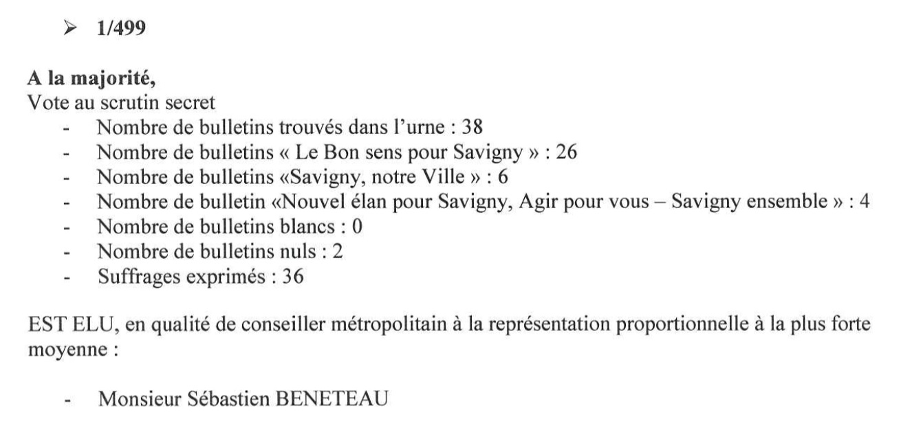 Mais ce n’est bien qu’un écran de fumée pour masquer qu’il y a eu une défection dans l’équipe municipale de la majorité. Comparez plutôt les résultats du vote pour l’élection du conseiller métropolitain (délibération n°1/499) avec les résultats du vote pour l’élection des conseillers territoriaux (délibération n°2/500) : 26 voix pour le candidat « Le bon sens pour Savigny » (LBSS) sur le premier scrutin. Mais plus que 25 pour la liste LBSS au deuxième.