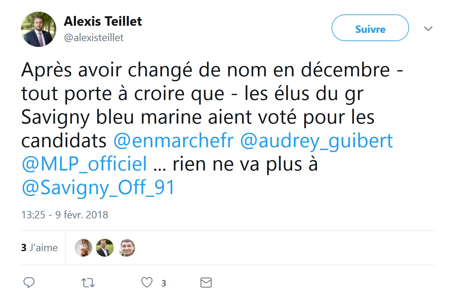 L’interrogation de TEILLET, critiquable sur sa forme, n’en est pas moins légitime sur le fond. Effectivement, on dirait bien, pour arriver à sept, que les deux voix du FN sont allées à la liste commune, accrochez-vous bien, « Un nouvel élan pour Savigny – Agir pour vous – Savigny ensemble » ou UNEPSAPVSE (le dernier ferme la porte en partant), lesquels étaient normalement assurés d’avoir cinq voix (les trois du groupe UDI/LaREM et les deux du groupe LaREM/MoDem).