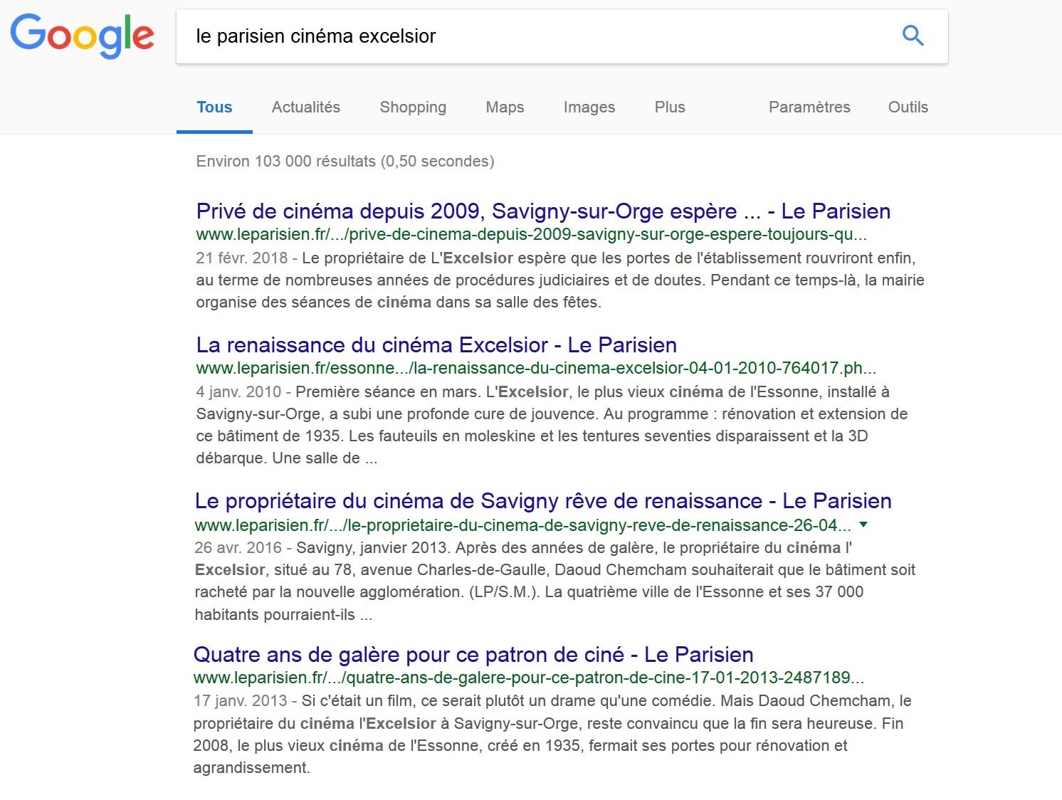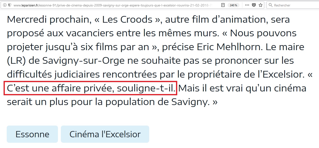 La présente déclaration du maire (« c’est une affaire privée ») figure dans l’article biennal (tous les deux ans) du Parisien de l’Essonne. C’est d’ailleurs peut-être la seule chose comique de cette histoire ; faire une recherche Google sur ce sujet et admirer la fidélité du Parisien : 2010, 2013, 2016, 2018… Le prochain article devrait donc être écrit en 2020 ou 2021 ! Sûrement d’ailleurs quand le sujet du cinéma se réinvitera dans les sujets de la prochaine élection municipale…