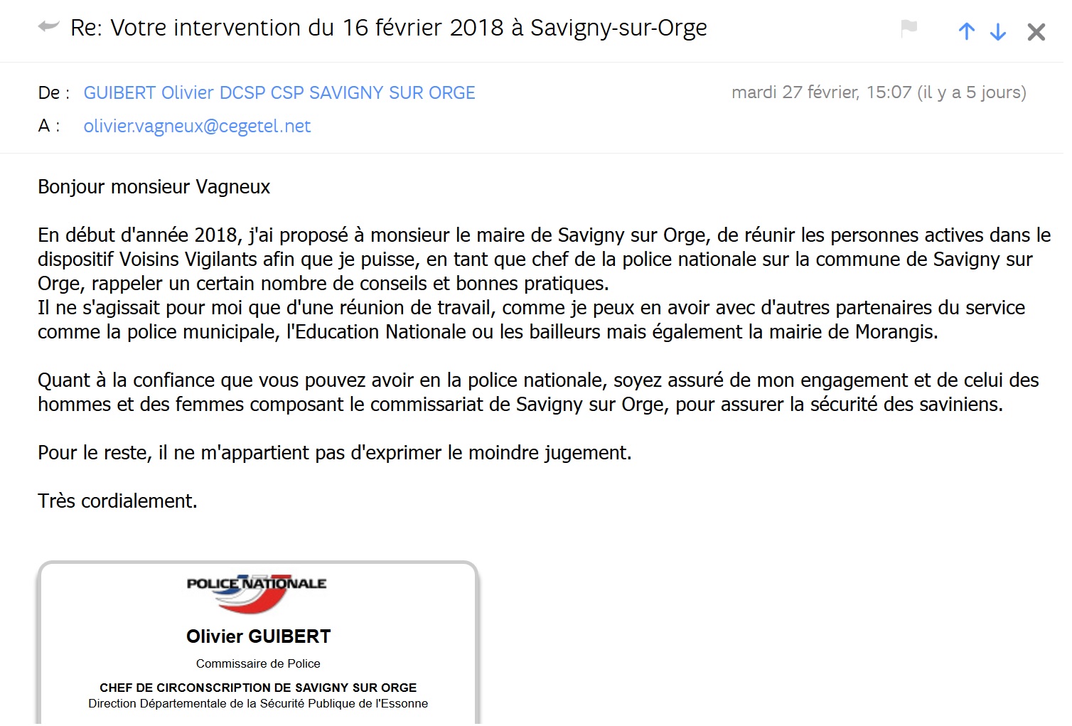 J’ai été trompé par la publication Facebook du maire de Savigny-sur-Orge, qui évoque « une cinquantaine de Saviniens« , sans préciser que ceux-ci sont des acteurs du dispositif de participation citoyenne, aux termes de la loi n° 2011-267 du 14 mars 2011 d’orientation et de programmation pour la performance de la sécurité intérieure, et de la circulaire du ministère de l’Intérieur du 22 juin 2011.