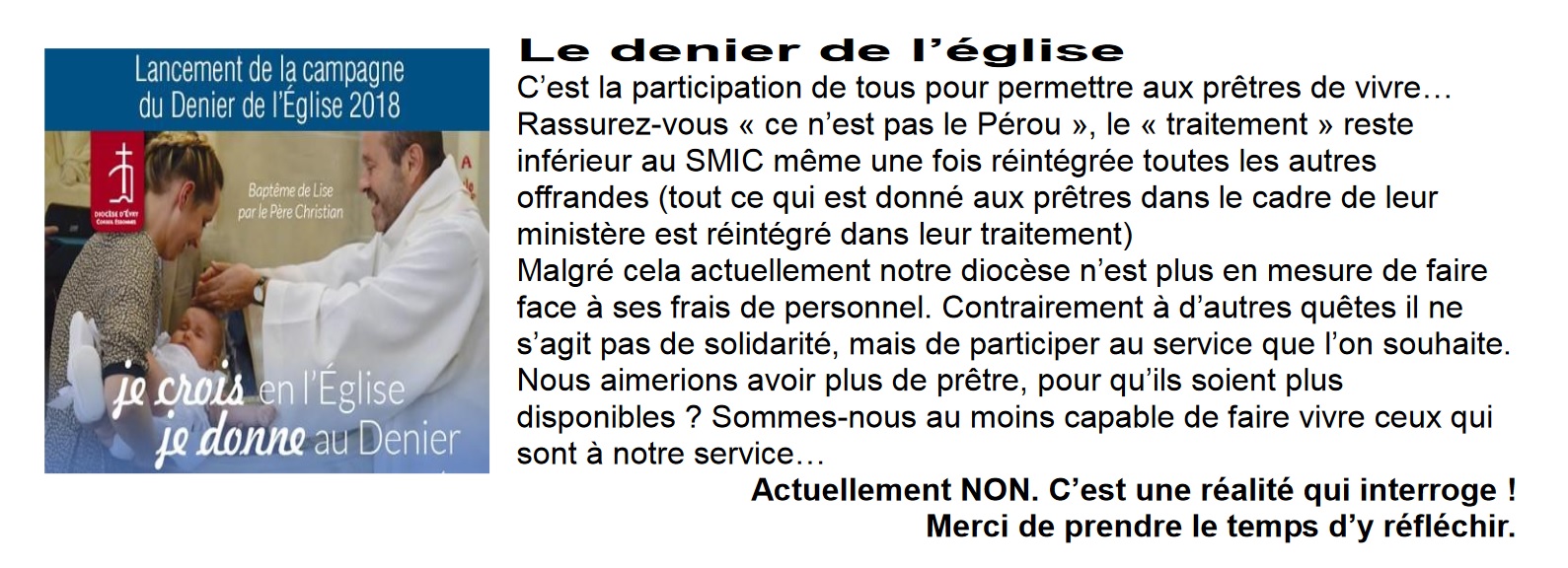 Cela se passe dans mon secteur pastoral (Savigny-Viry), dans mon diocèse (Évry – Corbeil-Essonnes), mais je pense que la critique pourrait s’appliquer ailleurs. Donc pour faire participer les chrétiens au Denier de l’Église, on leur raconte qu’ils auront des prêtres proportionnellement au fric qu’ils vont donner. Comme si les prêtres, dont je mets de plus en plus en doute l’indispensabilité, étaient ceux qui ruinaient les finances diocésaines…