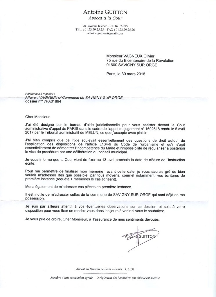 Alors évidemment, c’est beaucoup plus facile parce que j’ai gagné la première instance, et je constate en plus que l’avocat a bien compris quel était l’enjeu du dossier. Sauf qu’il a aussi compris que cela m’opposait à la Ville, alors que cela m’oppose à l’intercommunalité, et que tout l’argent dépensé par Savigny est perdu (environ 5000 euros), parce que la Ville n’était que partie observatrice à l’affaire ! Donc qu’elle n’était pas légitime à présenter des conclusions…