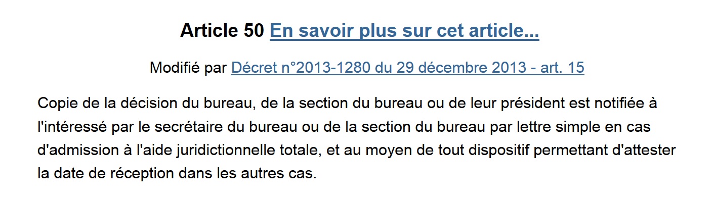 Et qu’est-ce que doit faire le bureau de l’aide juridictionnelle quand M. VAGNEUX obtient, ô surprise quand on connaît le montant de ses revenus, le bénéfice total de l’aide juridictionnelle ? On doit lui envoyer un courrier simple pour l’en informer, c’est l’article 50 du décret n°91-1266 du 19 décembre 1991 relative à l’aide juridique. Cela n’a pas été fait, et j’ai donc moins de huit jours pour communiquer avec mon avocat…