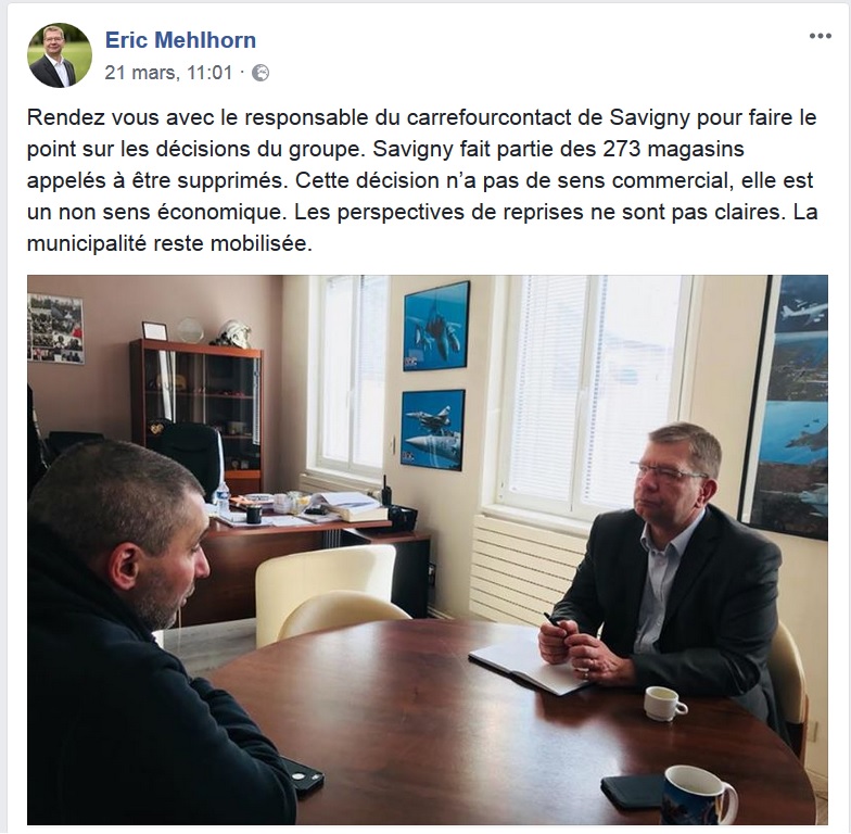 Car lisez bien les messages Facebook qui suivent, et réécoutez la dernière intervention du maire à ce sujet en Conseil municipal du 11 avril 2018, MEHLHORN n’indique pas qu’il va se battre pour que le magasin actuel ne ferme pas (on se demande d’ailleurs bien ce qu’il pourrait faire) ! Il critique certes la décision mais il écrit surtout s’inquiéter qu’il n’y ait pas de reprise et qu’il en cherche, même s’il n’a rien trouvé de concret jusque-là, donc pour lui la fermeture est actée !