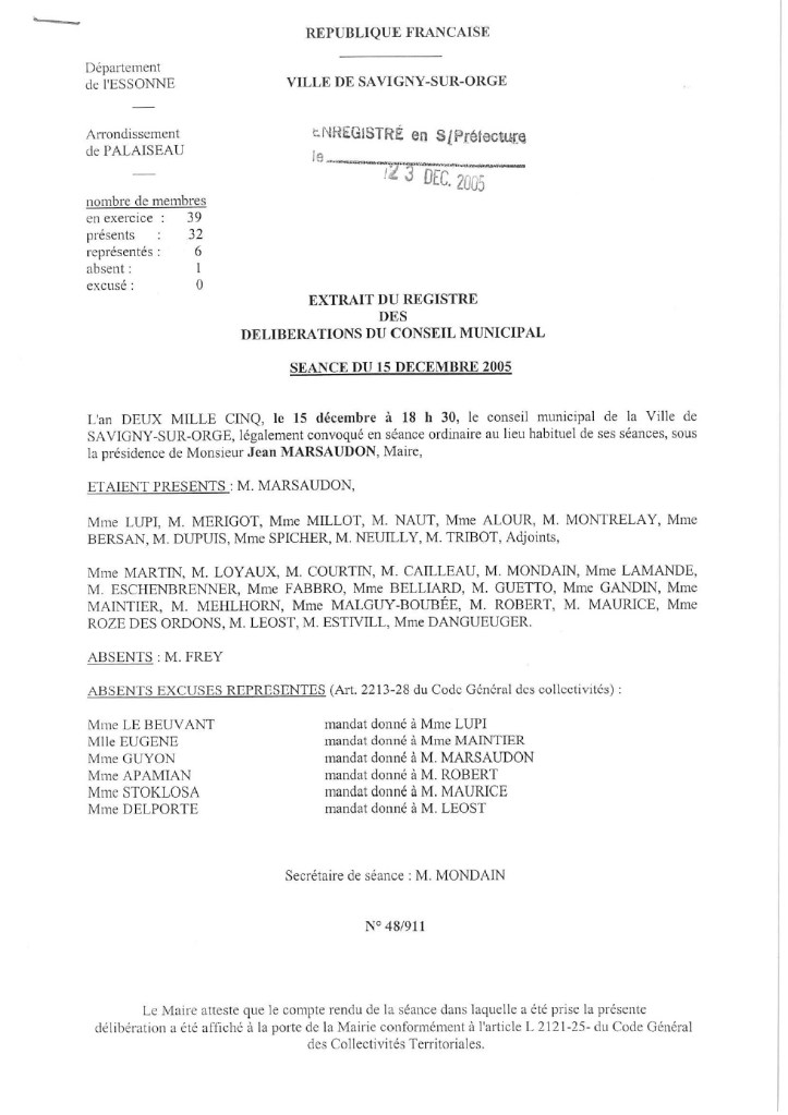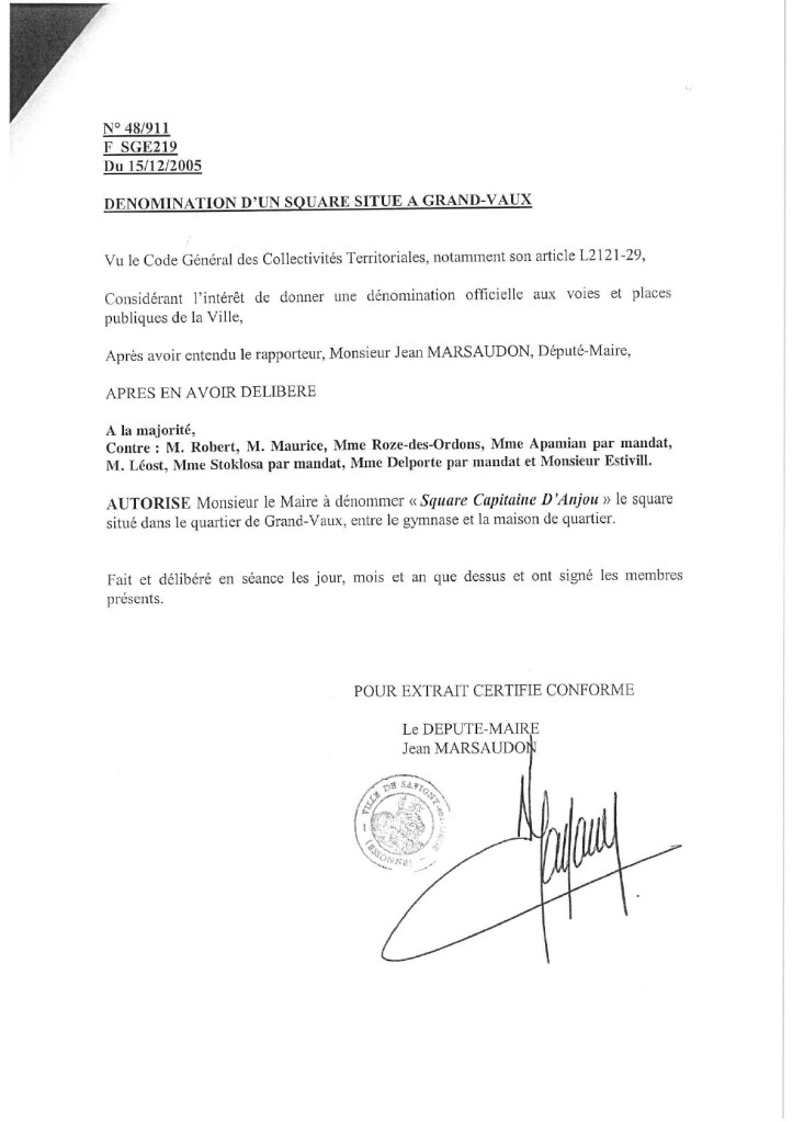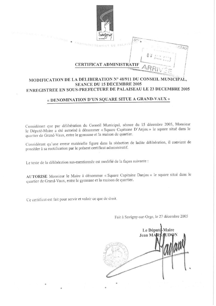 En ce jour de la fête de la Légion étrangère, jour anniversaire de la bataille de Camerone, je publie ici la délibération retrouvée, datant de 2005, et dénommant le square du capitaine Danjou à Grand-Vaux. Donc cet acte a bien été accompli conformément à la Loi. Je rappelle cependant que ce qu’une délibération a fait, une autre délibération peut le défaire. Même si en l’occurrence, il n’y a donc pas ou plus de raison de revenir sur ce nom…